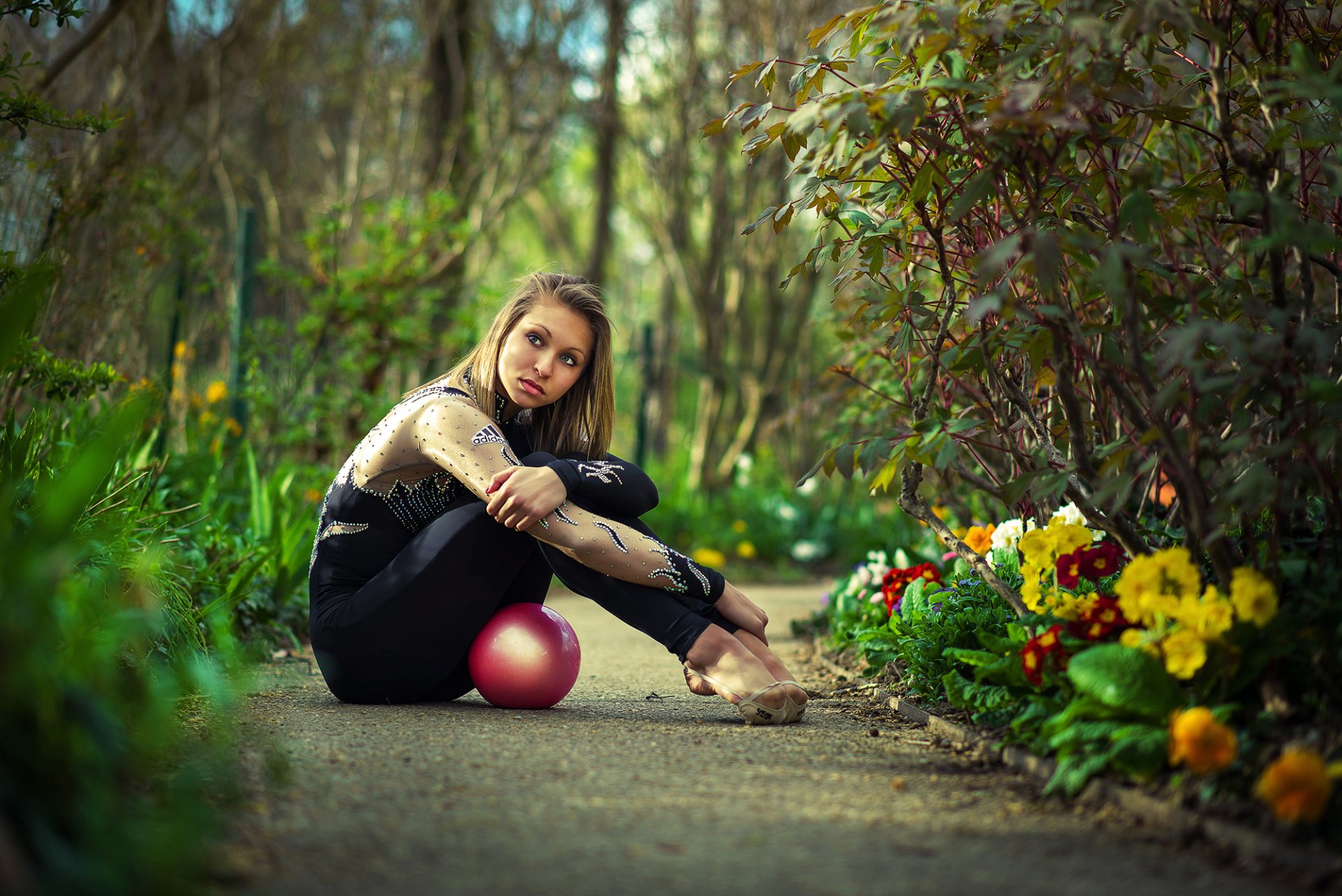 Photo of a rhythmic gymnast with a ball in the gardenPhoto of a rhythmic gymnast with a ball in the garden
