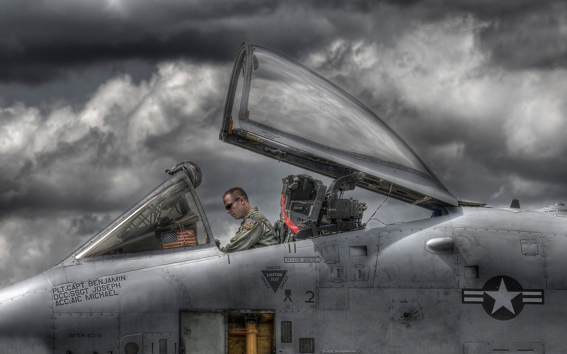 The pilot sits in the cockpit of the aircraft in cloudy weather