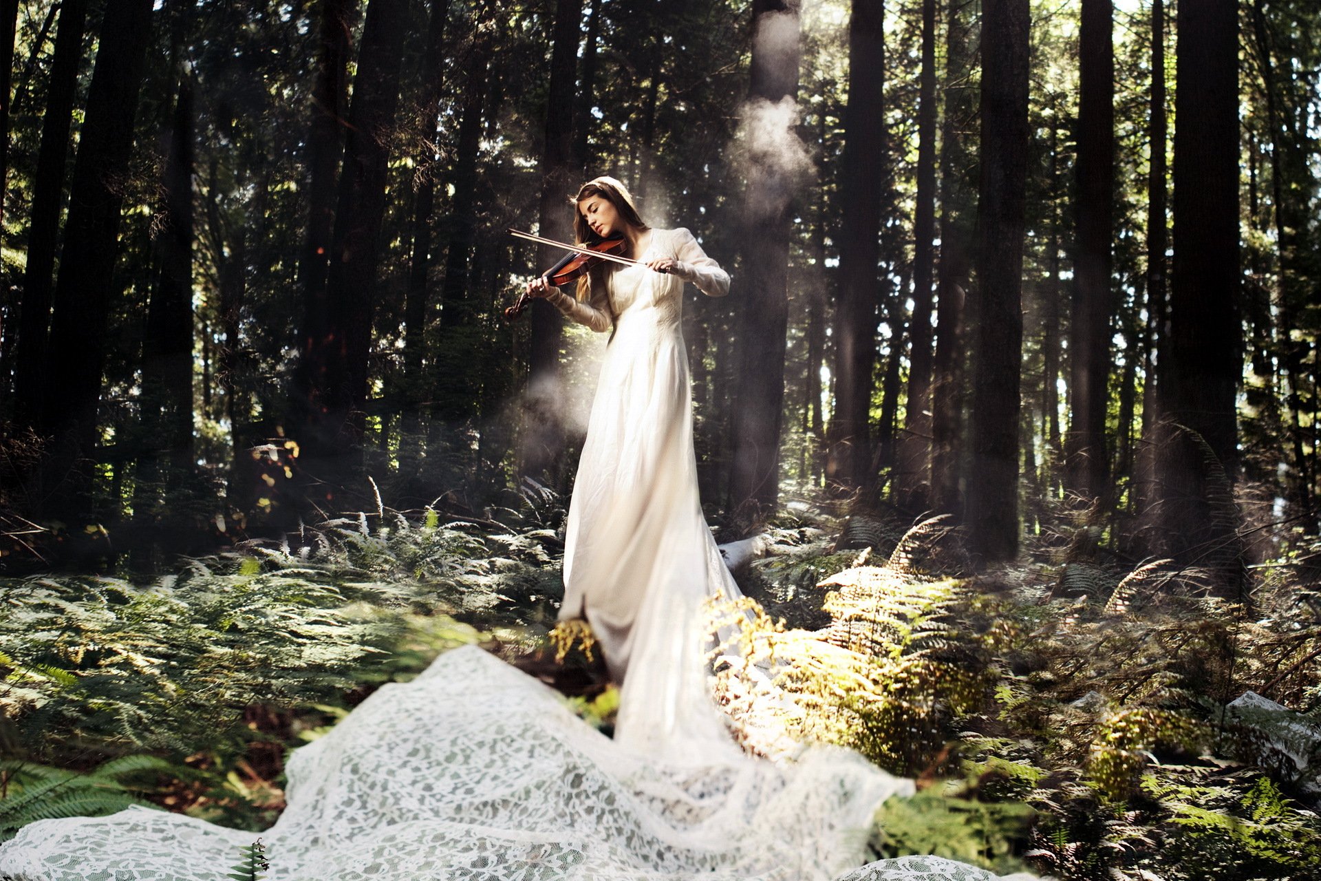 A girl with a violin in a white dress against a forest backgroundA girl with a violin in a white dress against a forest background
