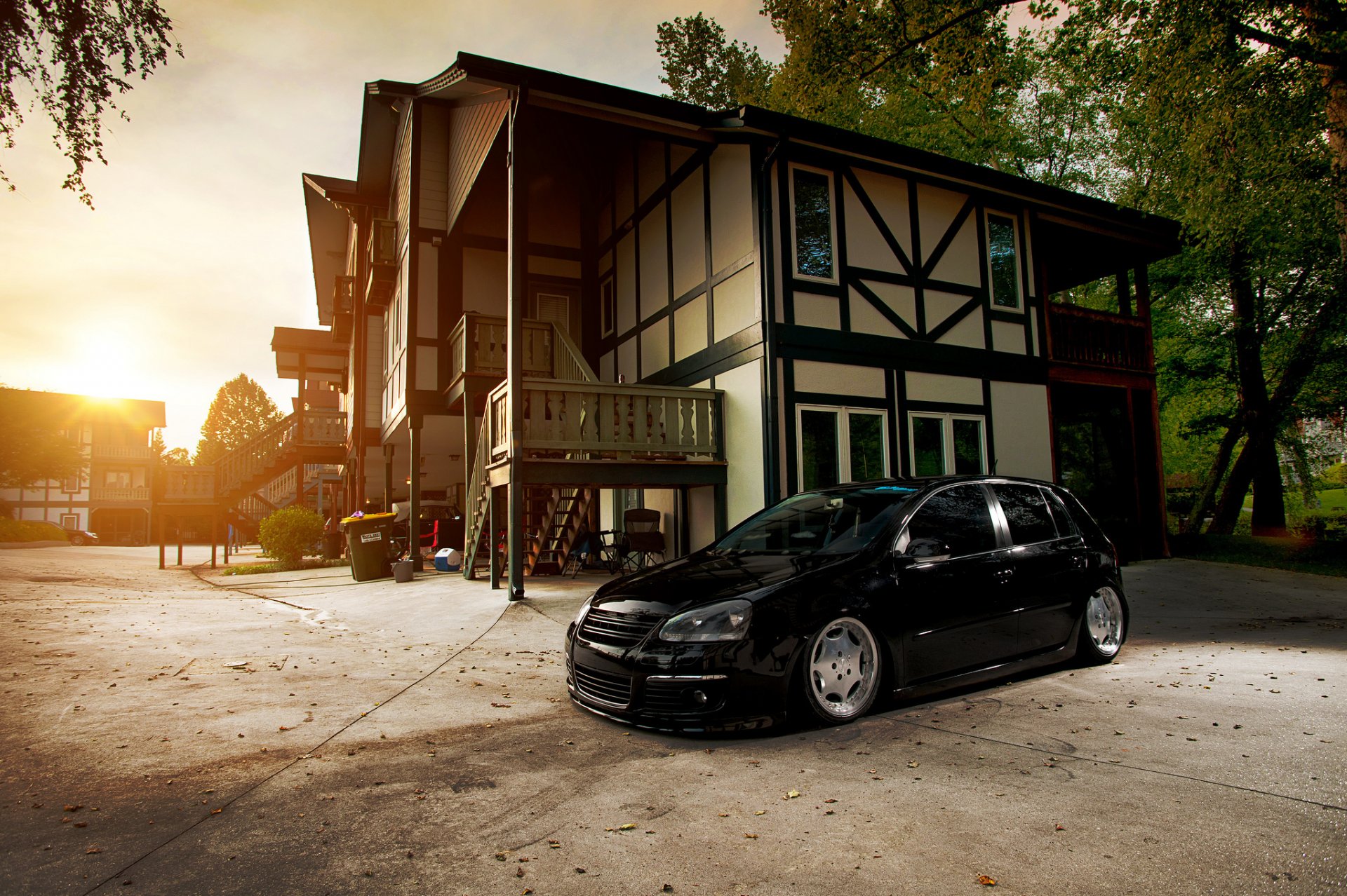 Black volkswagen on the background of a dream houseBlack Volkswagen on the background of a dream house