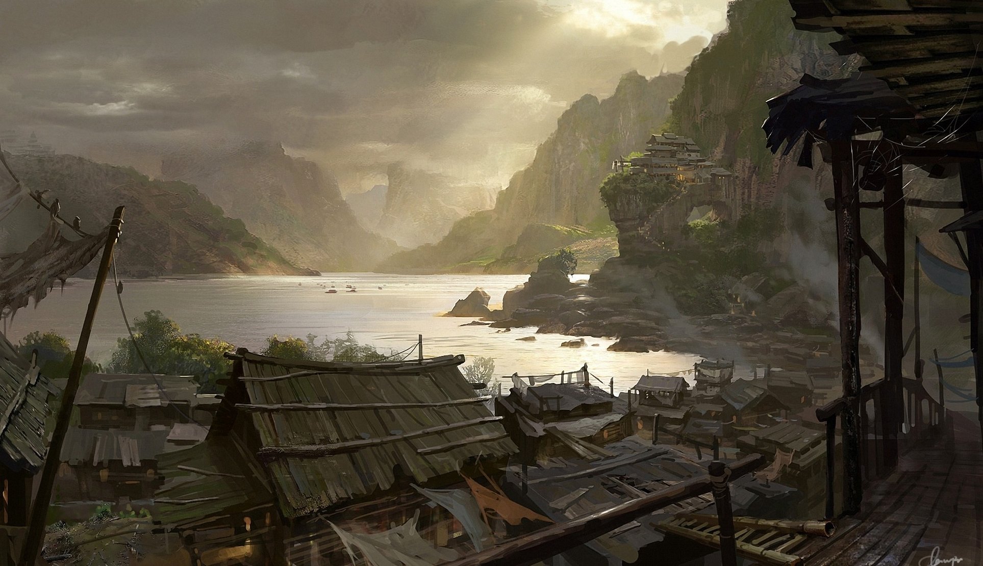 A village by a lake at the foot of a mountain with lush greeneryA village by a lake at the foot of a mountain with lush greenery