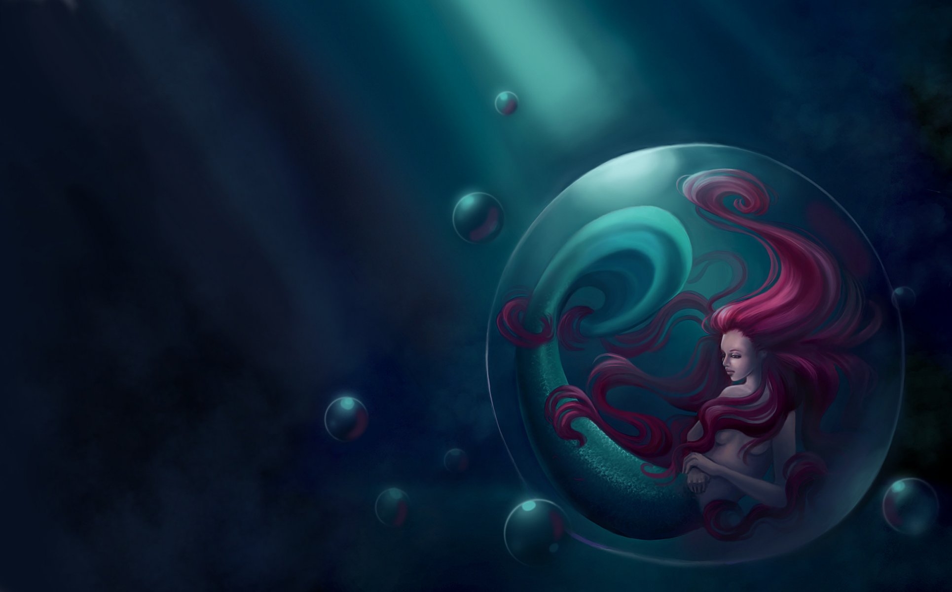 A mermaid with red hair in a bubble at the bottom of the seaA mermaid with red hair in a bubble at the bottom of the sea