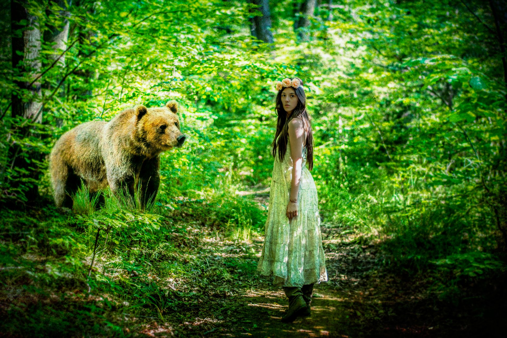 A girl in a dress in the forest with a bear