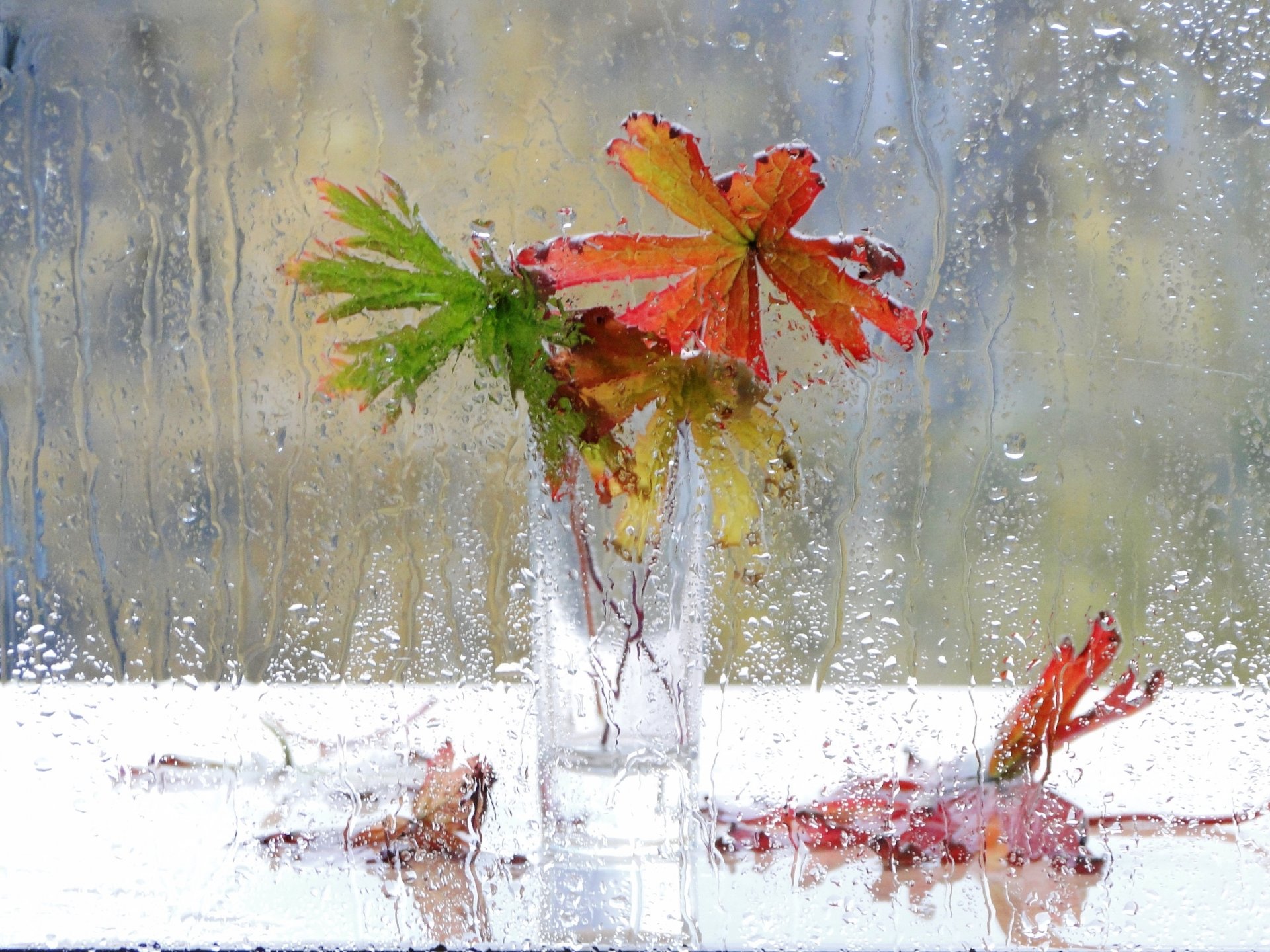 Leaves in a glass on the table outside the rainy windowLeaves in a glass on the table outside the rainy window