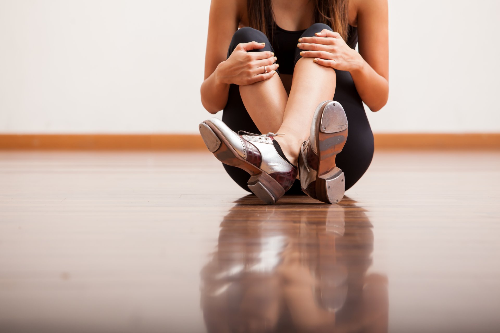 The girl is sitting on the floor, resting from dancingThe girl is sitting on the floor, resting from dancing