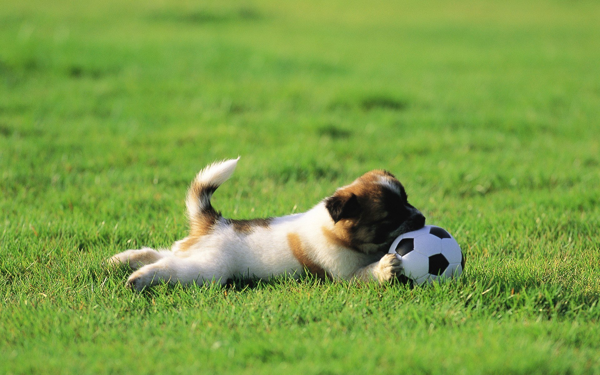 A little puppy is lying on the lawn with a soccer ball