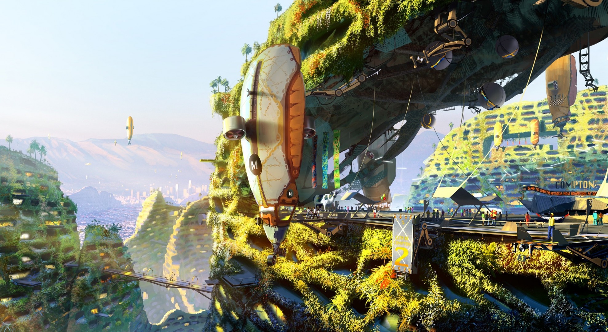 Post-apocalyptic landscape. green hills and the airshipPost-apocalyptic landscape. Green hills and the airship