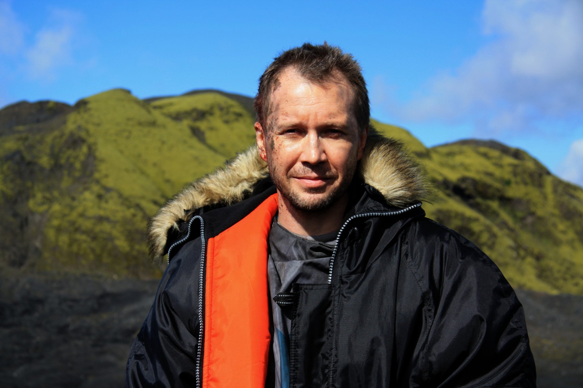 Actor Evgeny Mironov with a dirty face smiles at the audience