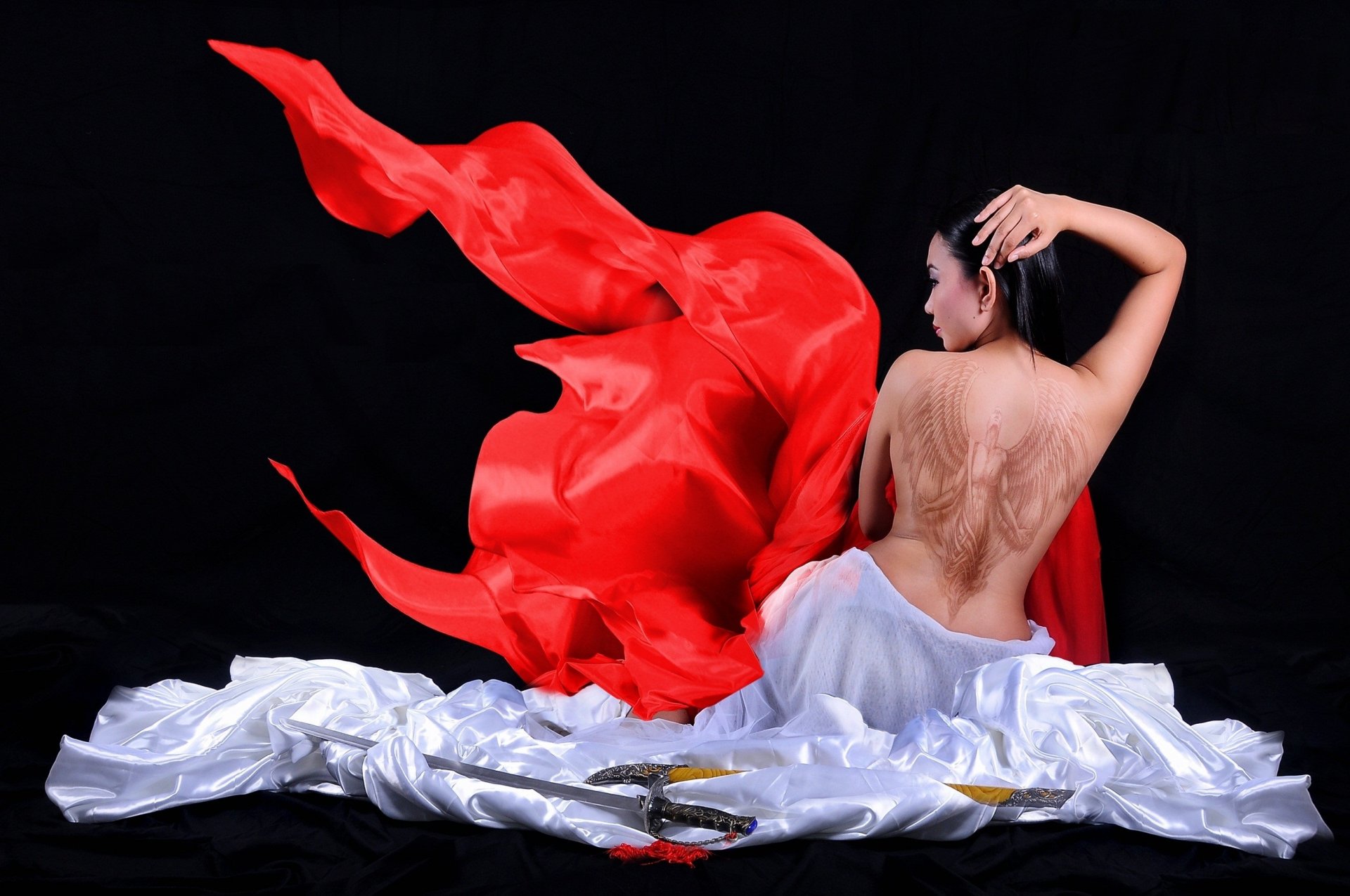 Asian woman with a tattoo of wings on a black backgroundAsian woman with a tattoo of wings on a black background