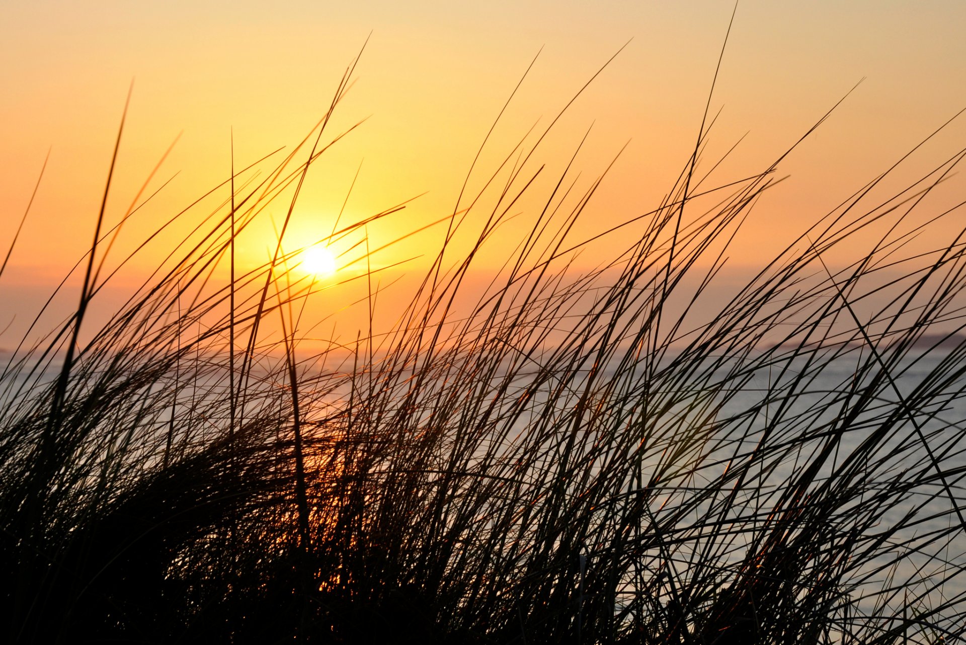 At sunset, water and grass on the background