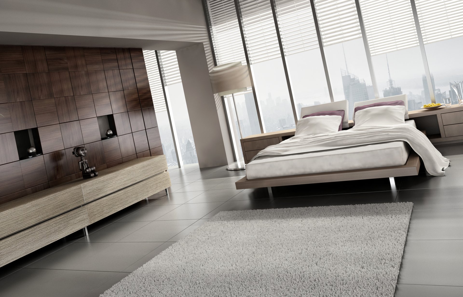 Stylish bedroom interior with panoramic windows