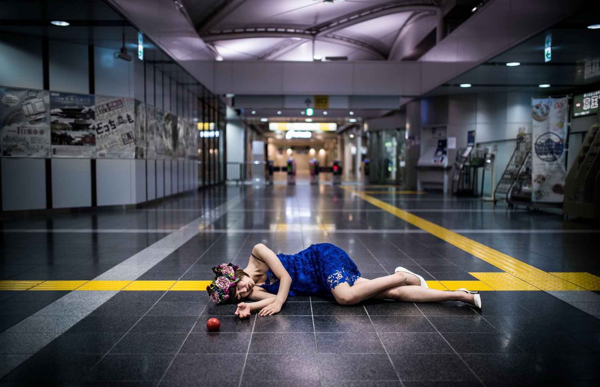 A girl lying in a blue dress on the floor with an appleA girl lying in a blue dress on the floor with an apple