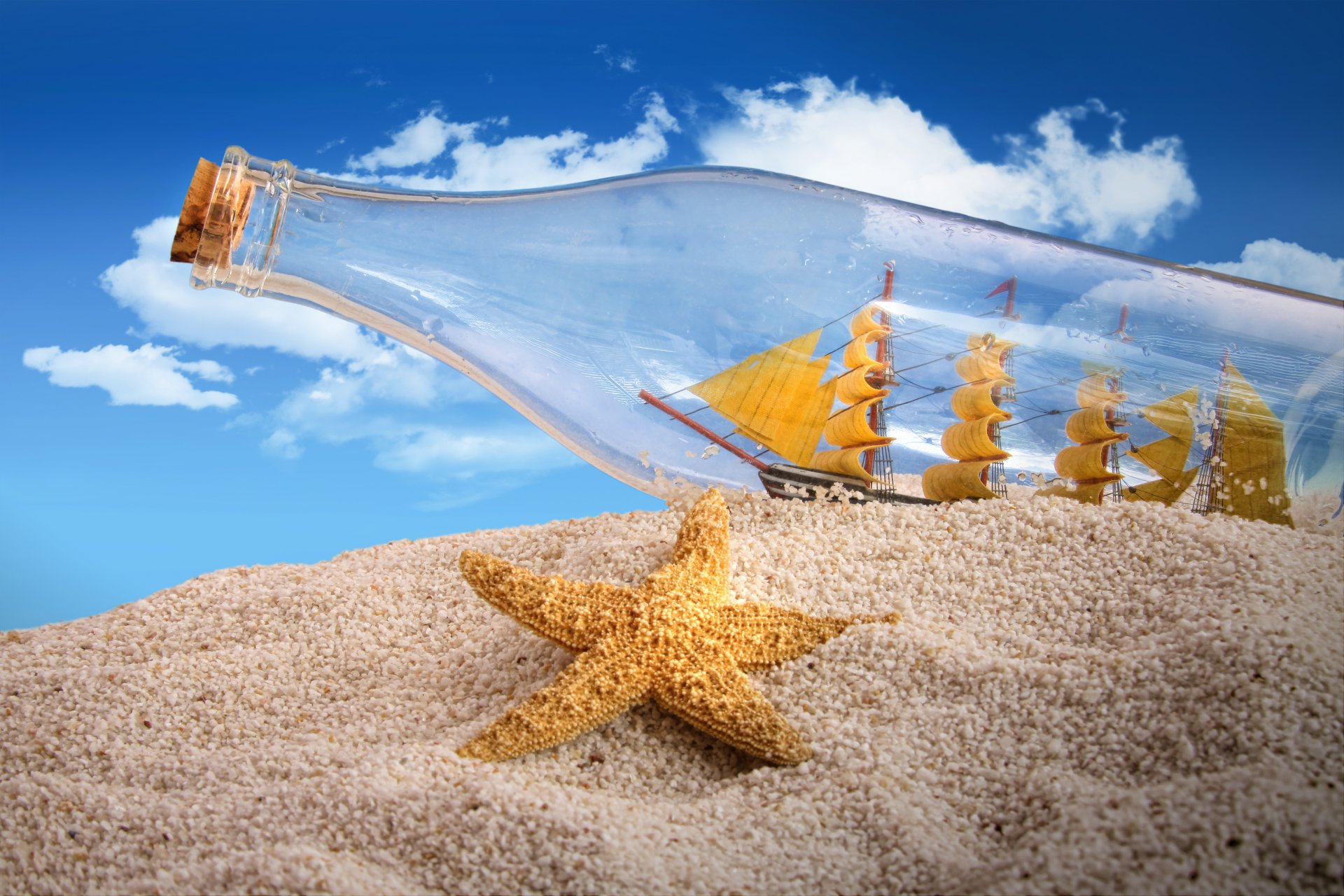 Bottle with a boat on a sandy beach