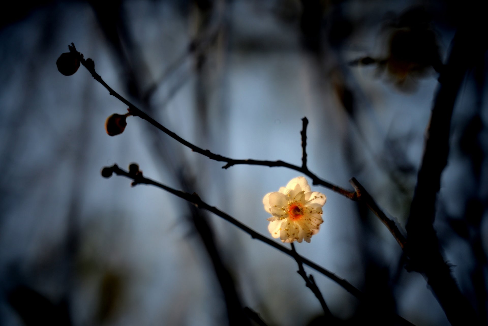 A white flower on a branch at dusk