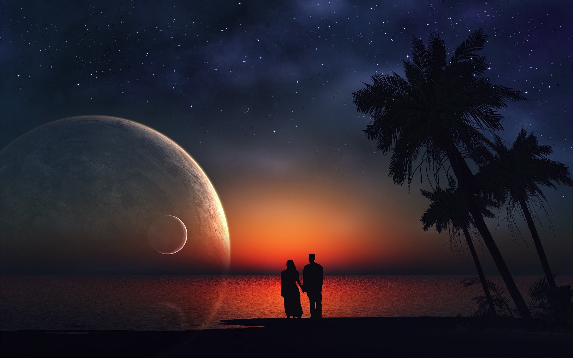 A man and a woman look at the sky with two planets holding handsA man and a woman look at the sky with two planets holding hands