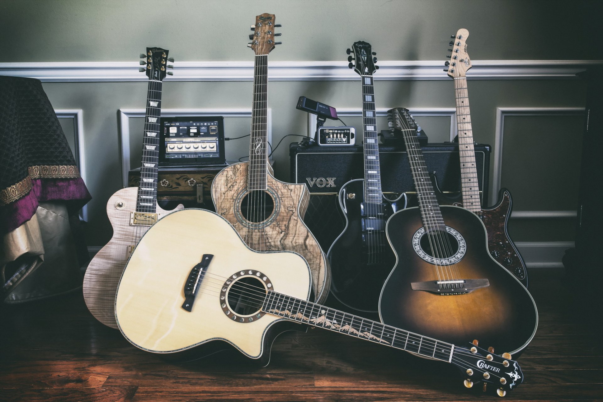 Guitars stand against the background of combos