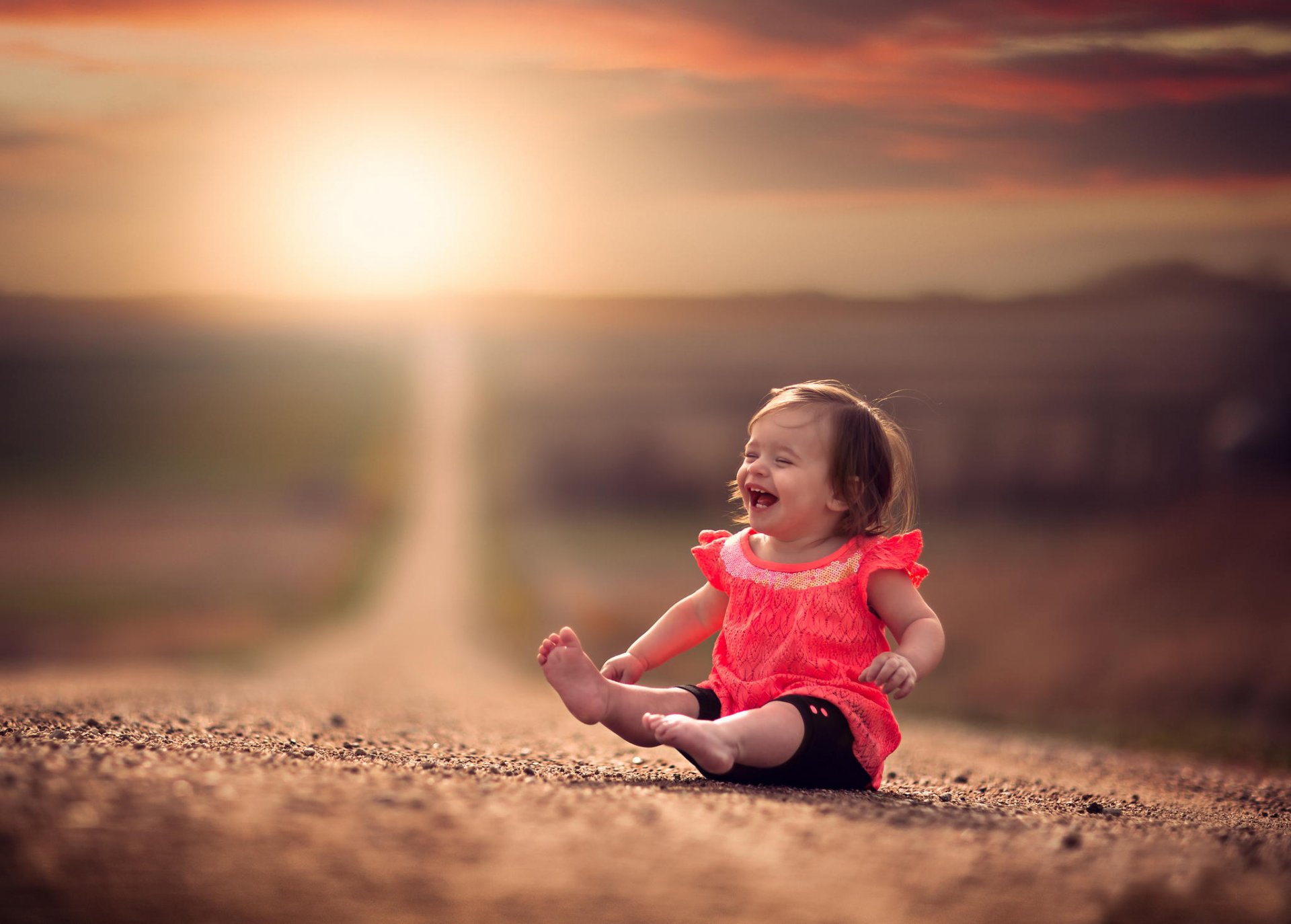 A cheerful little girl is sitting on the road