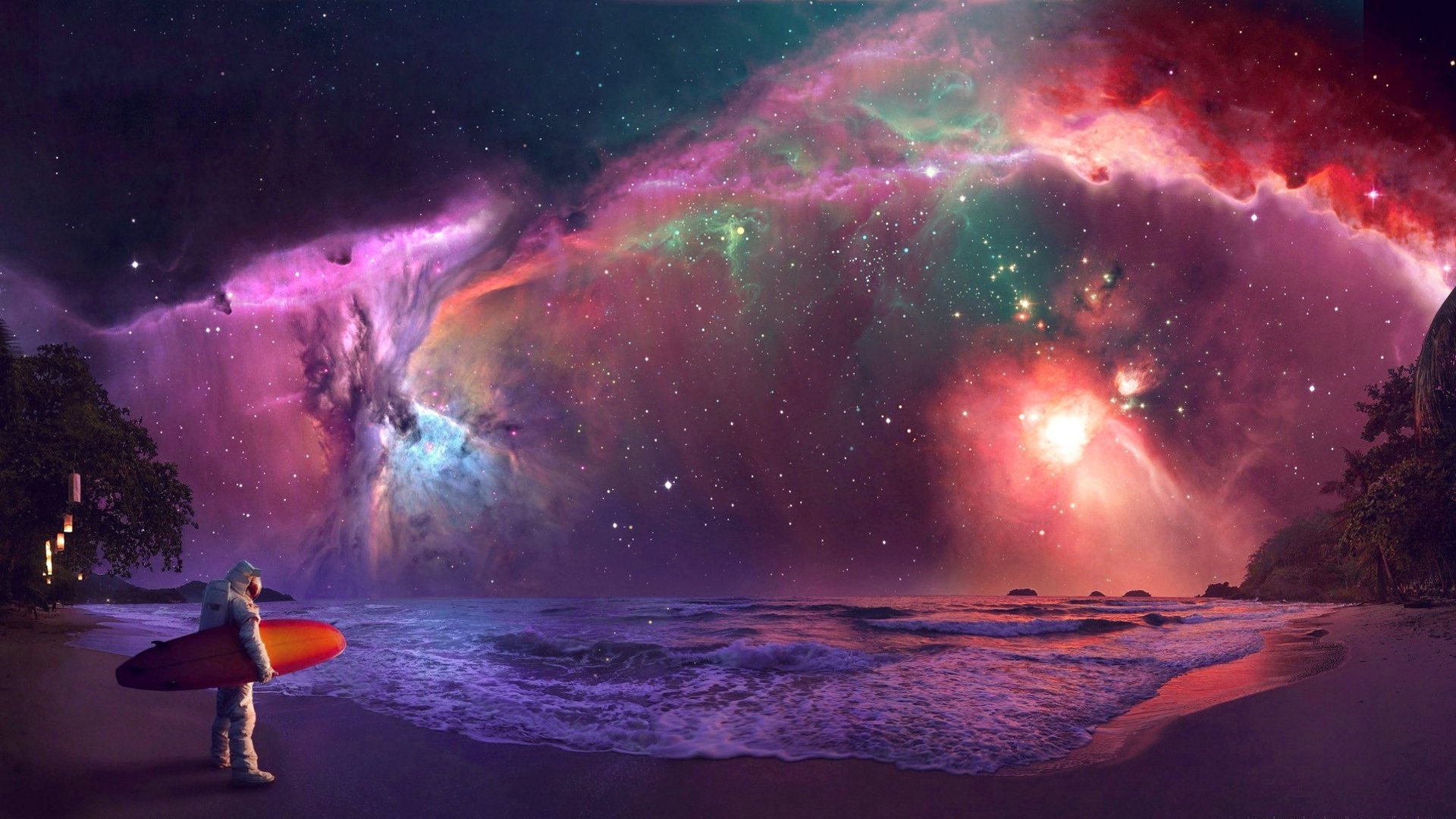 Multicolored cosmic galaxies on the background of the planetMulticolored cosmic galaxies on the background of the planet