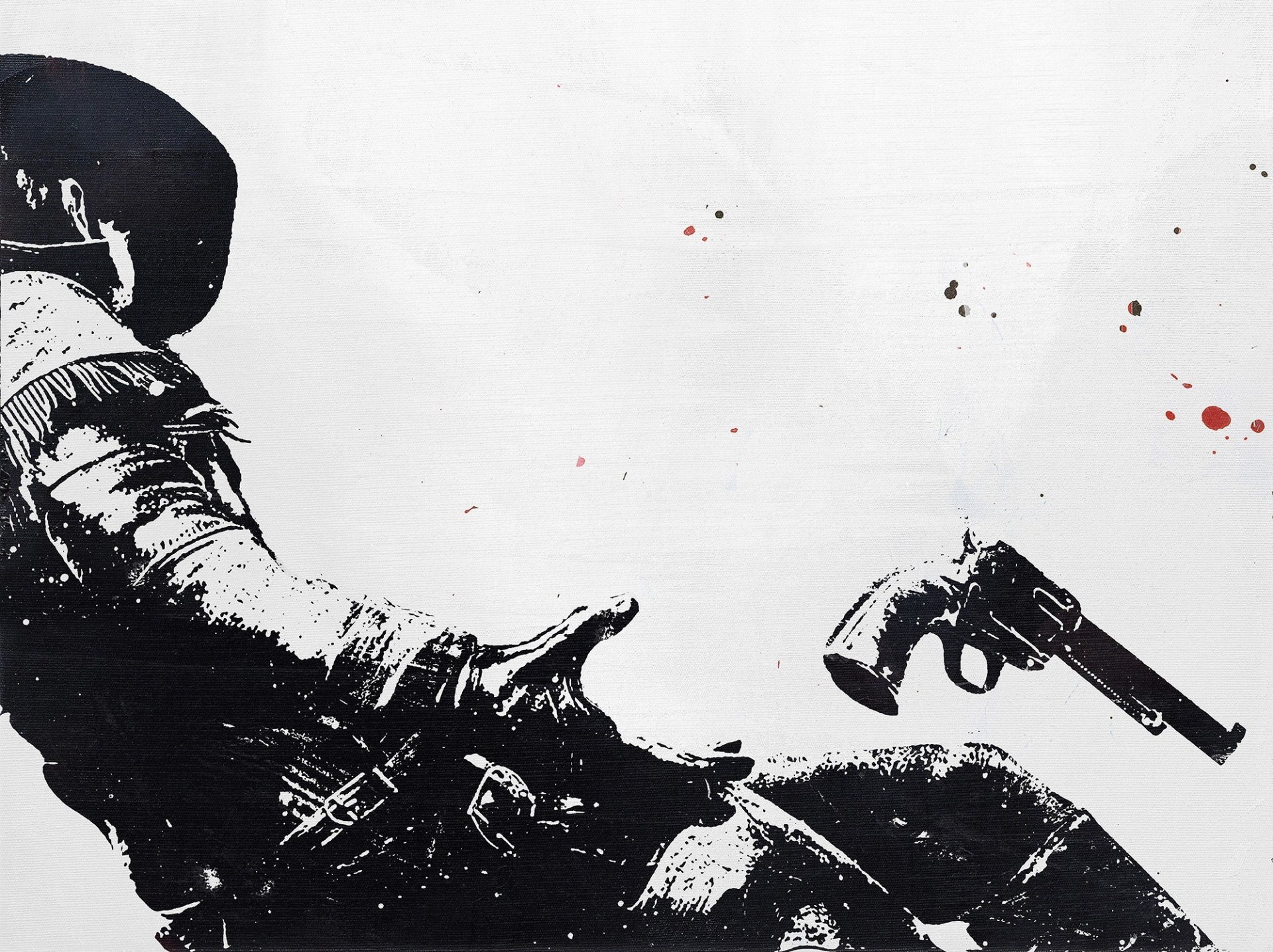 Black and white drawing of a cowboy with a revolver