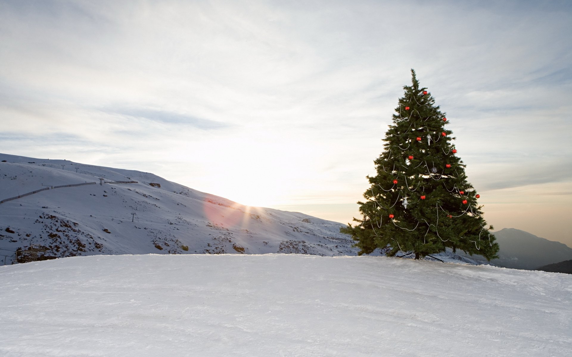 Winter mountains and decorated Christmas tree