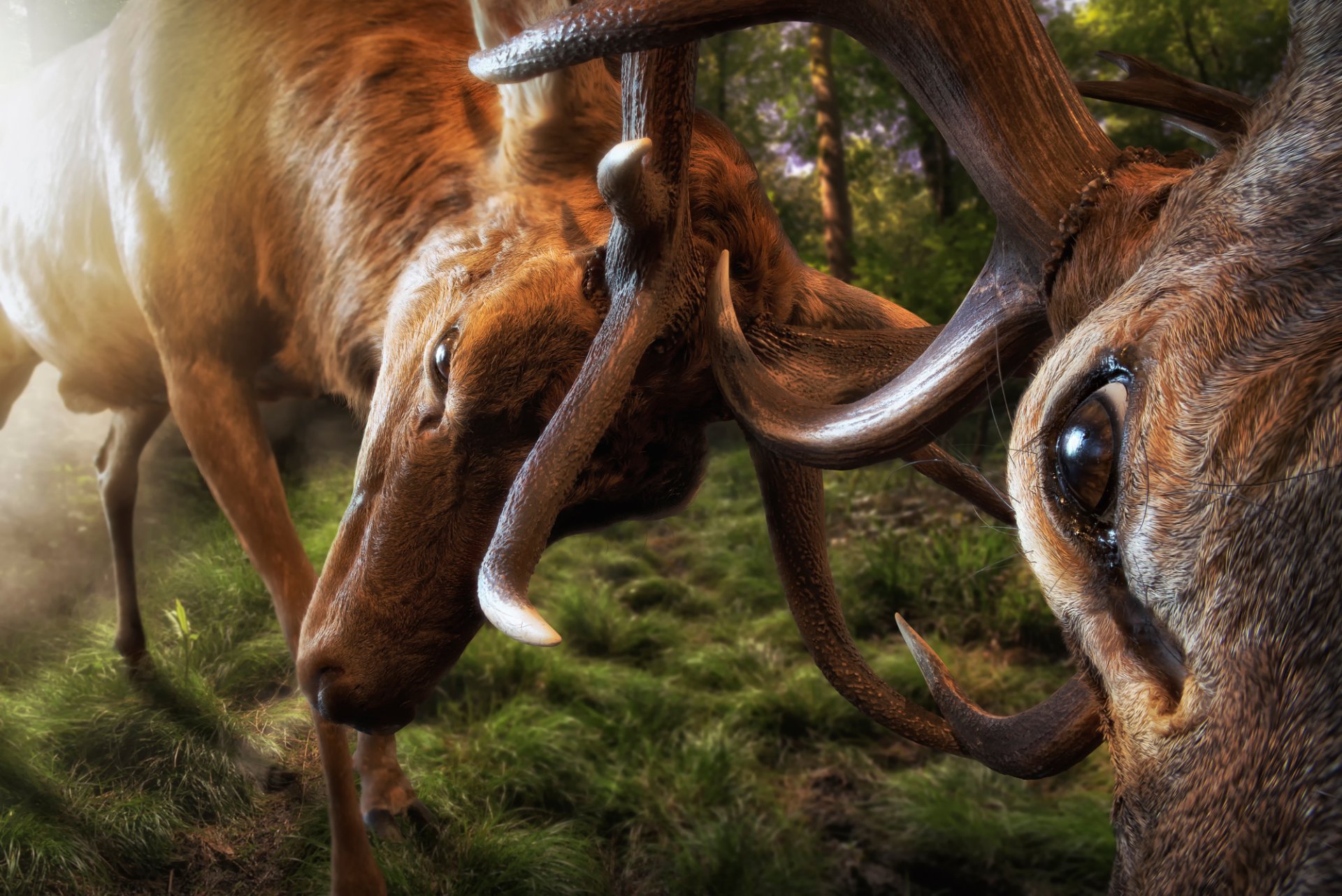 A wolf with deer antlers runs across the grass to an abandoned cityA wolf with deer antlers runs across the grass to an abandoned city