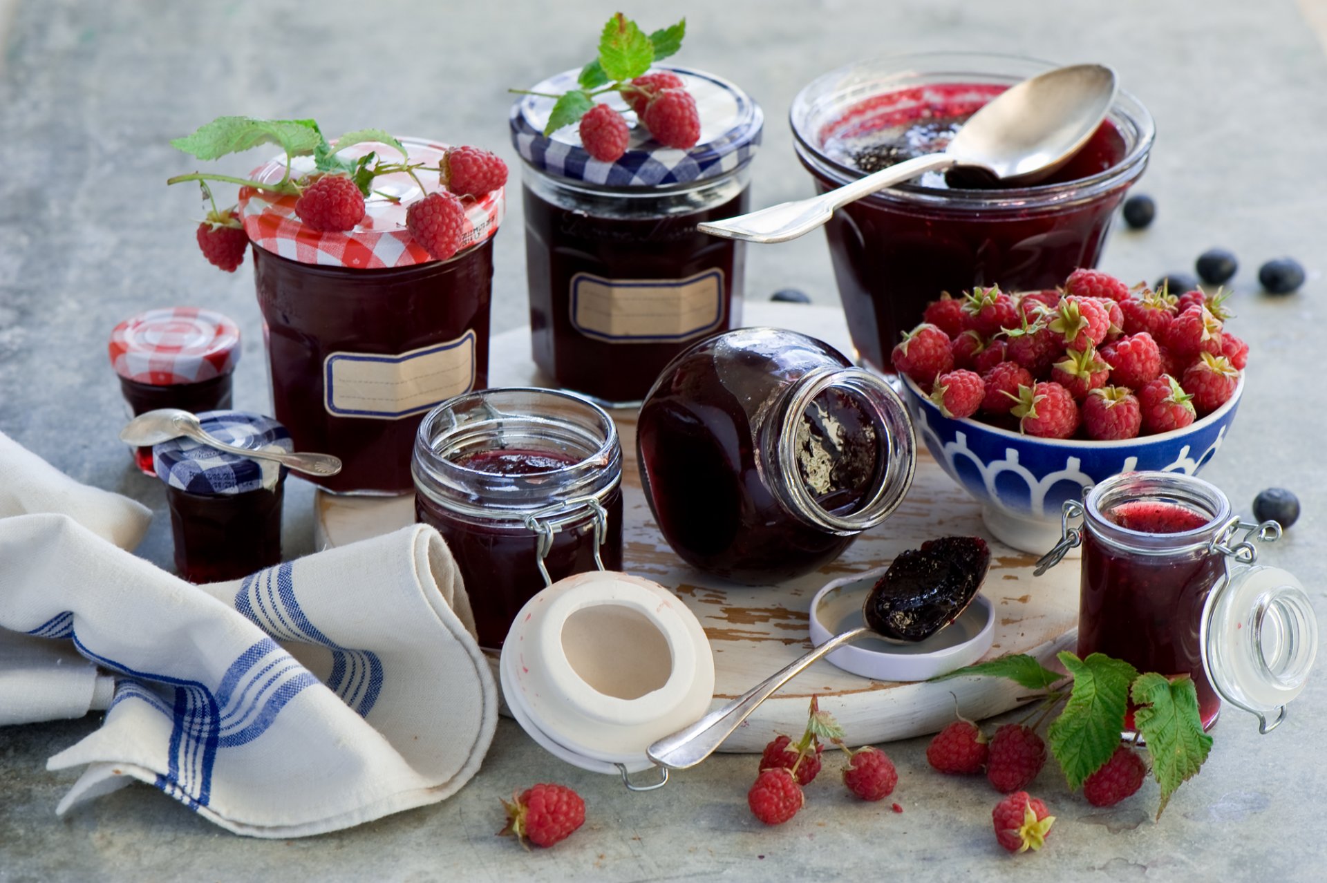 On the table there are jars of jam and a deep plate with raspberries