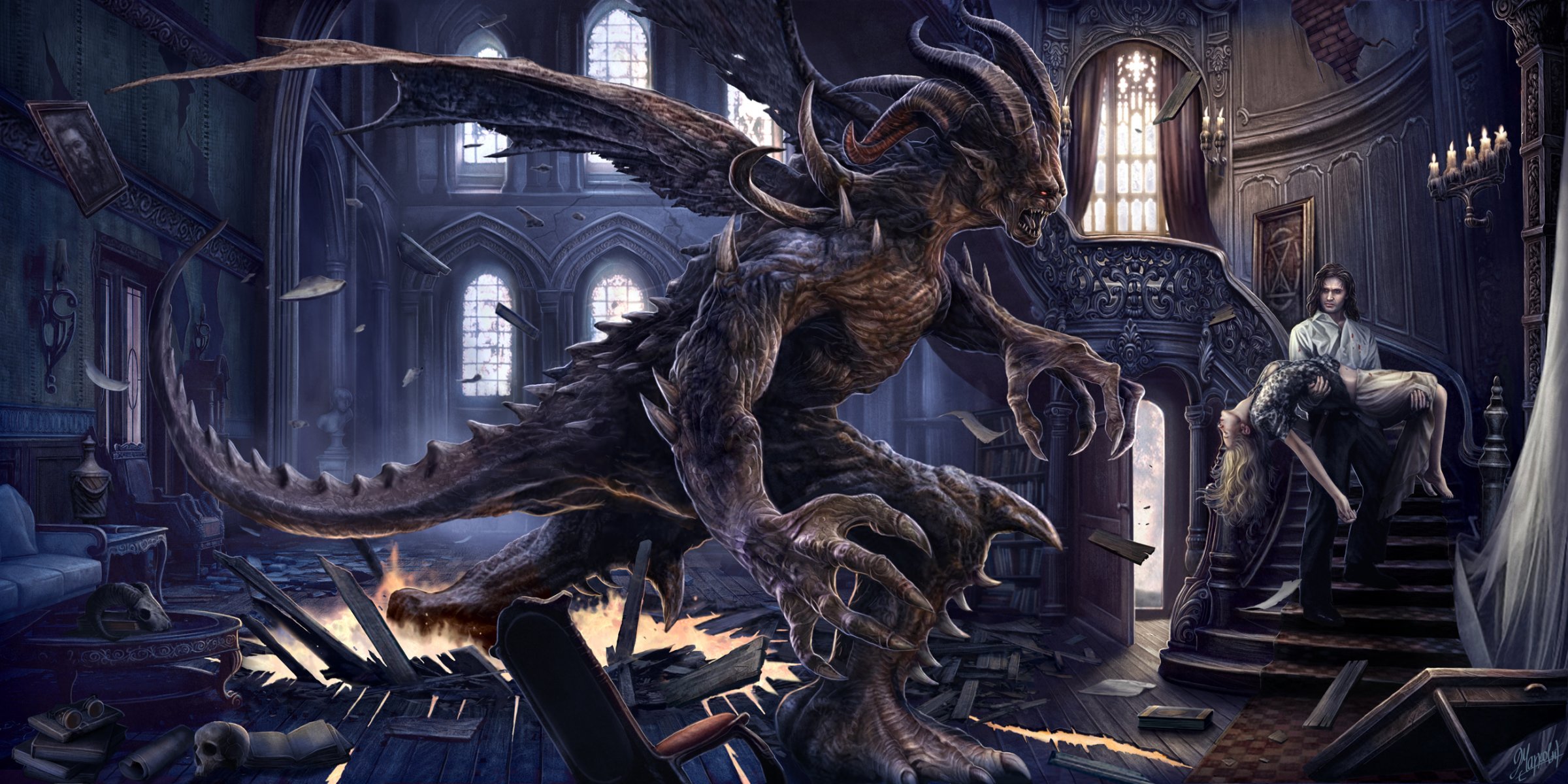 A demon with big wings and horns