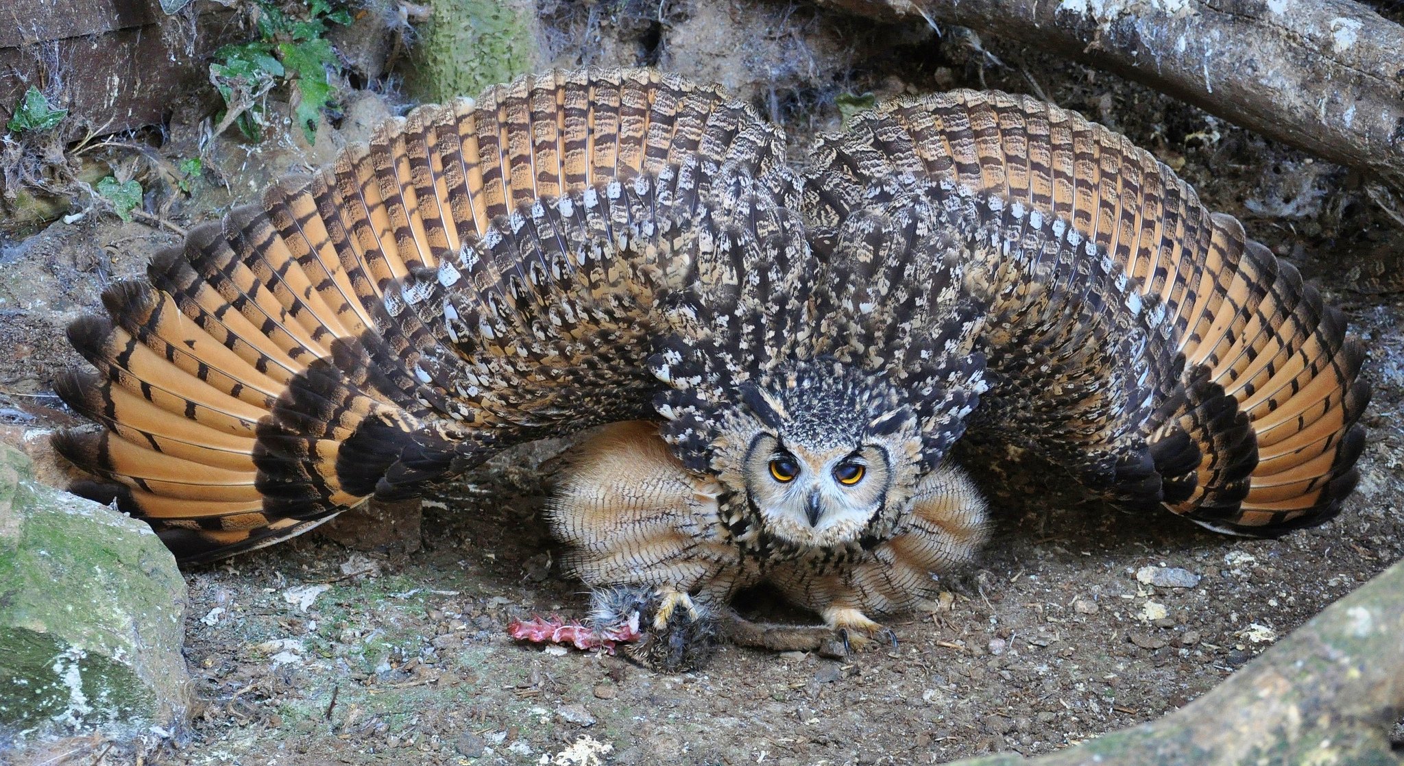 A painted owl looks at a worm