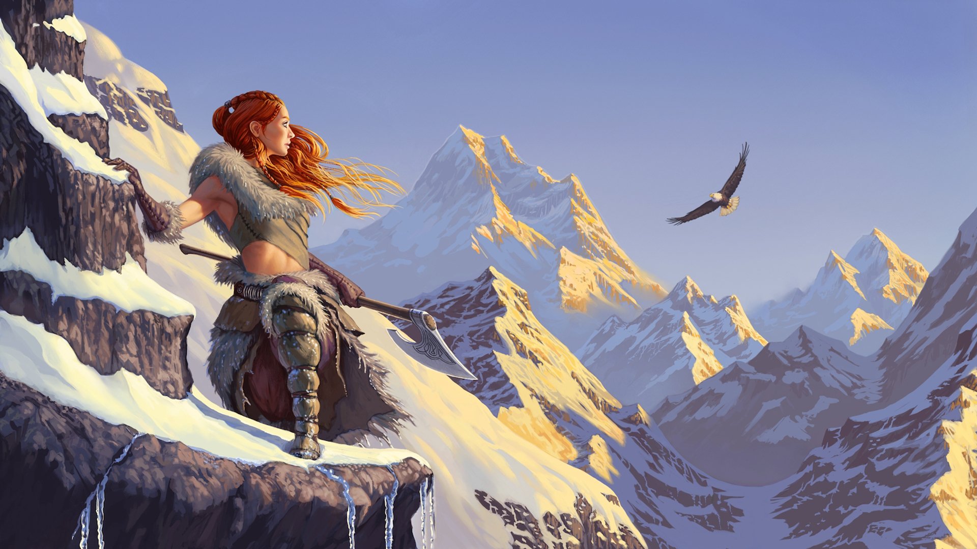 Red-haired girl with an axe in the snowy mountainsRed-haired girl with an axe in the snowy mountains
