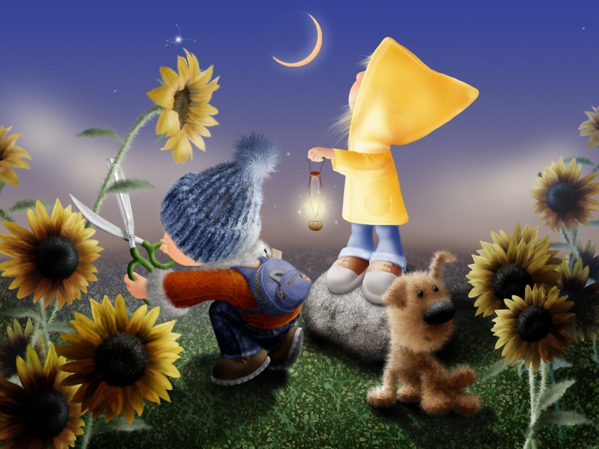 A moonlit night and happy children with a fairy taleA moonlit night and happy children with a fairy tale