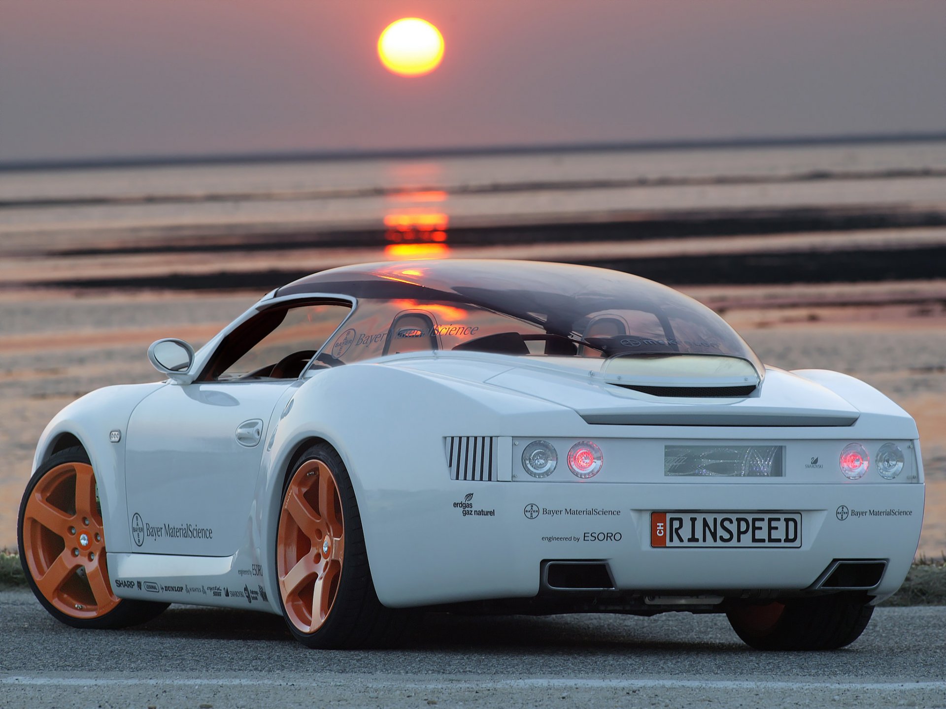 The car is on the seashore. Sunset