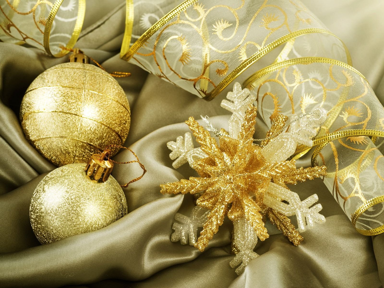 New year's balls of golden color with a snowflake and a bowNew Year's balls of golden color with a snowflake and a bow