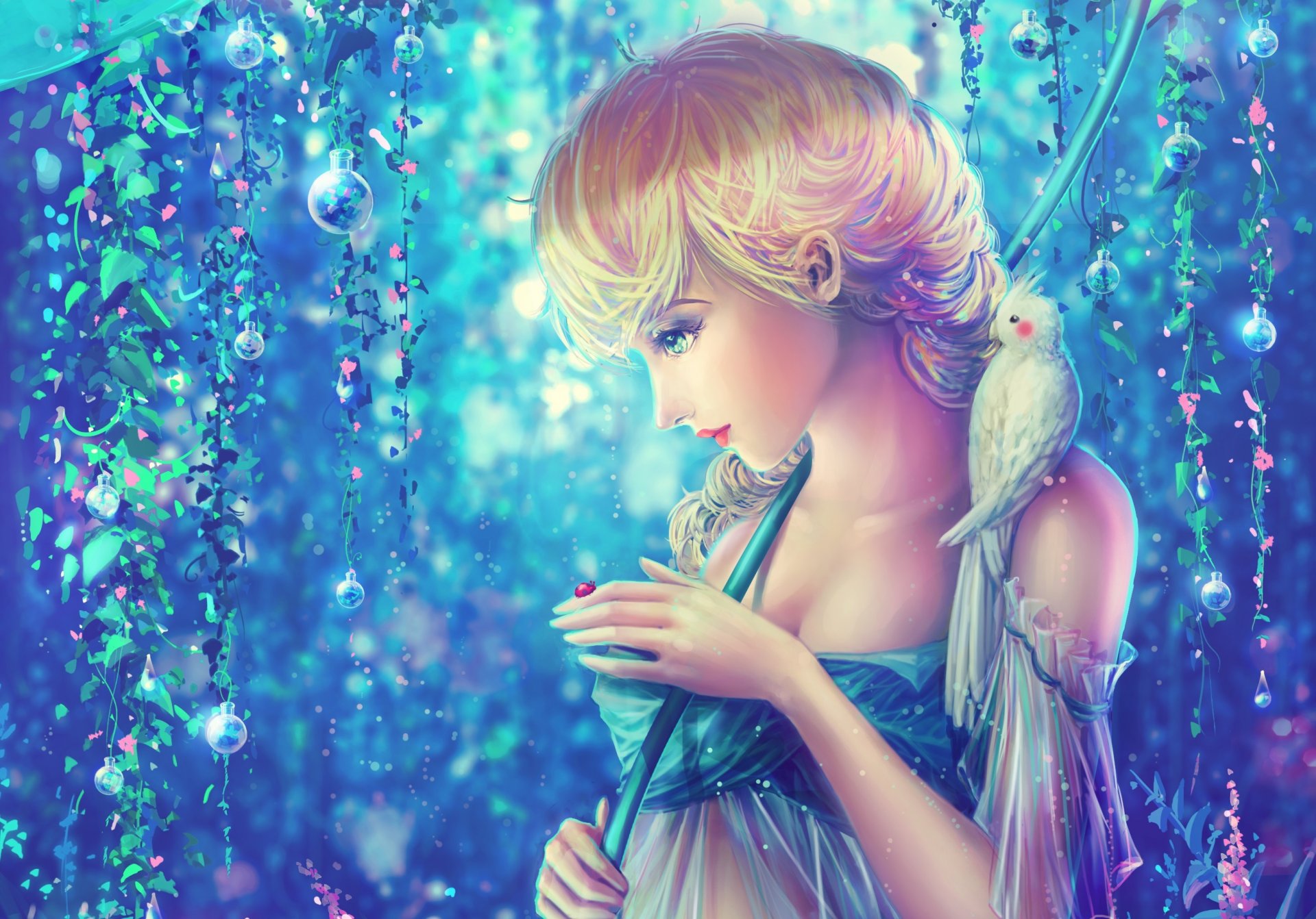A girl with long hair and a parrot on her shoulderA girl with long hair and a parrot on her shoulder