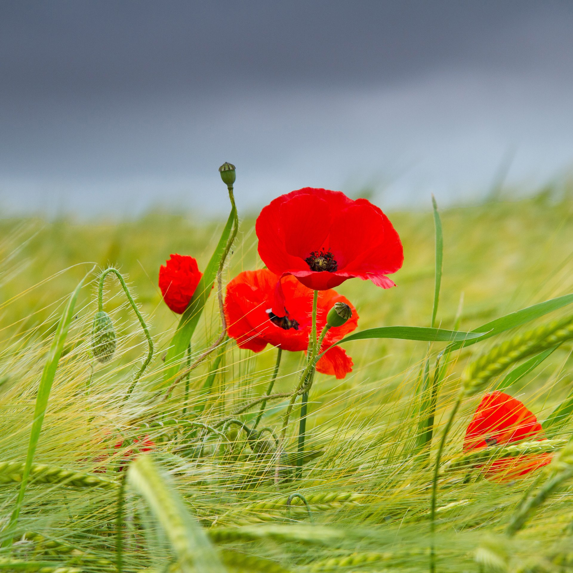 Green field of red poppies