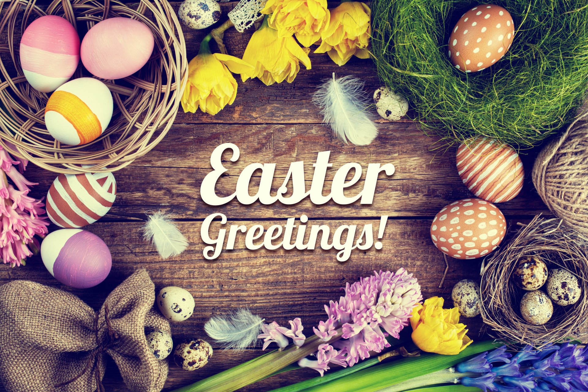 Easter baskets with eggs. Spring flowers. Hyacinths and daffodils