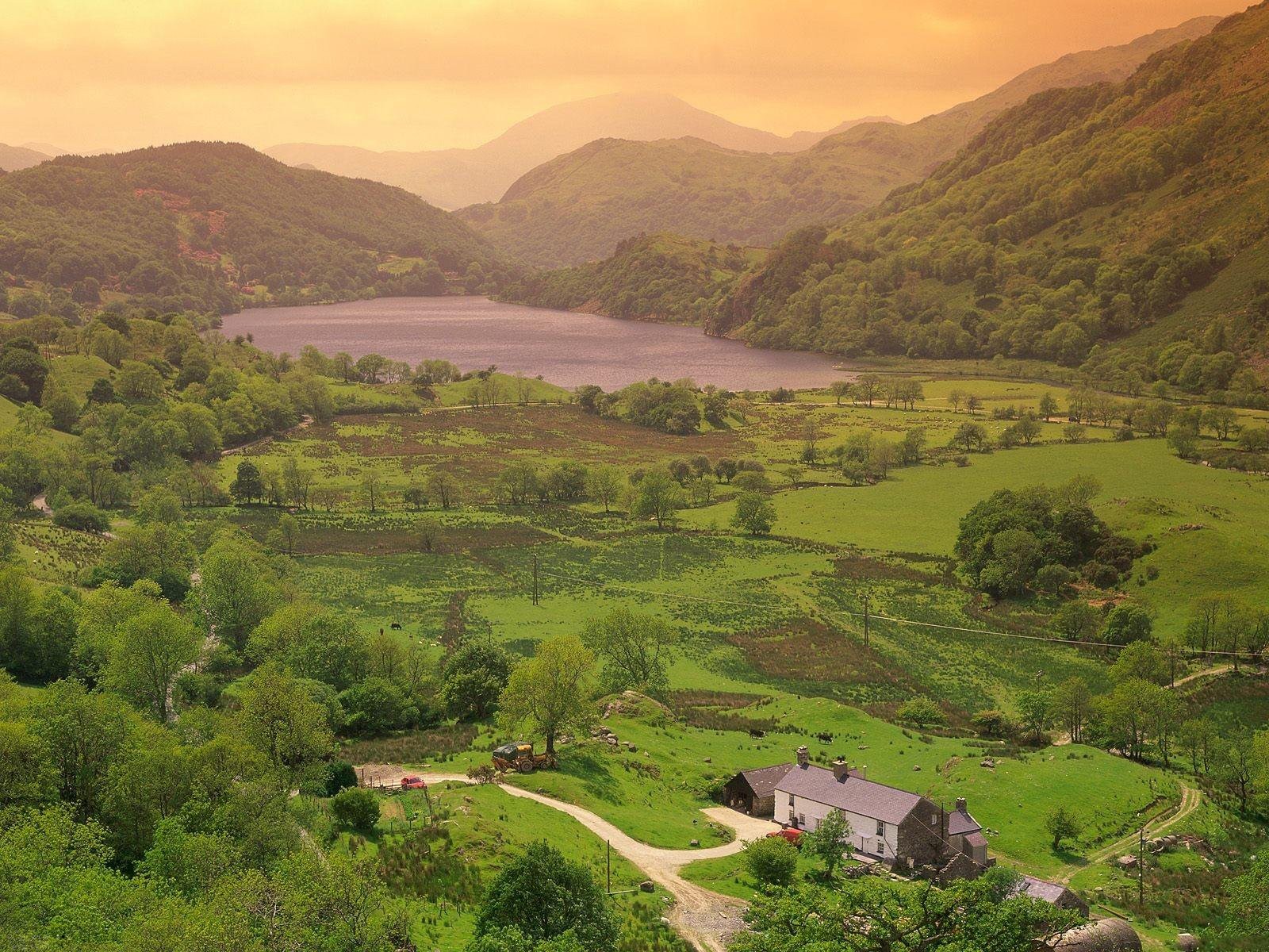 A bright village among green fields