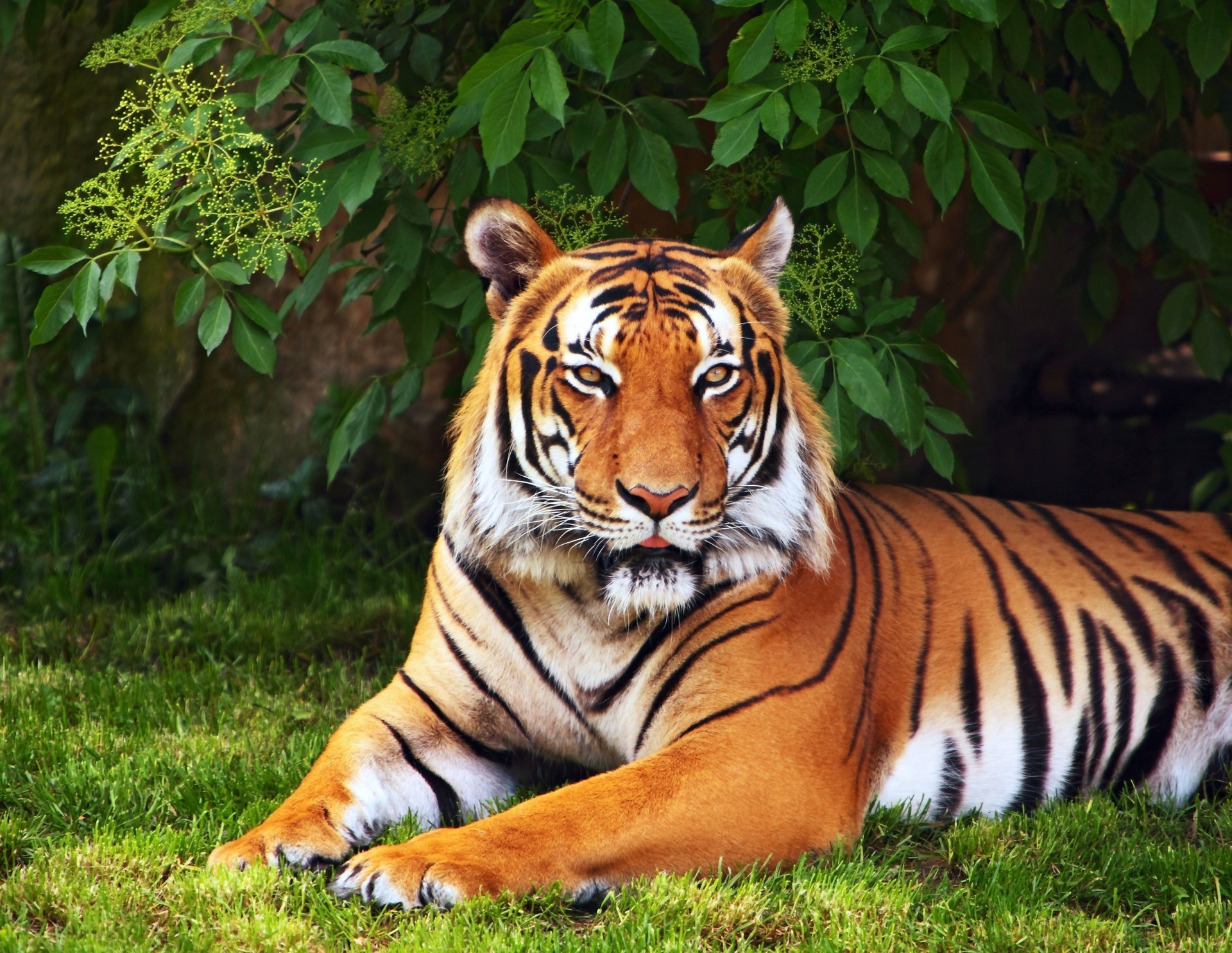 A formidable tiger is resting among the dense green vegetationA formidable tiger is resting among the dense green vegetation