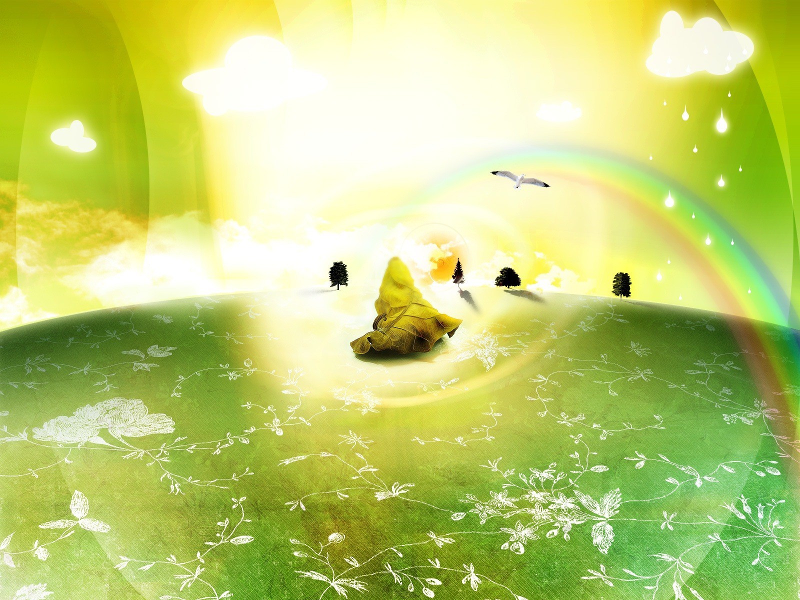 Abstract drawing of a rainbow, clouds on a green backgroundAbstract drawing of a rainbow, clouds on a green background
