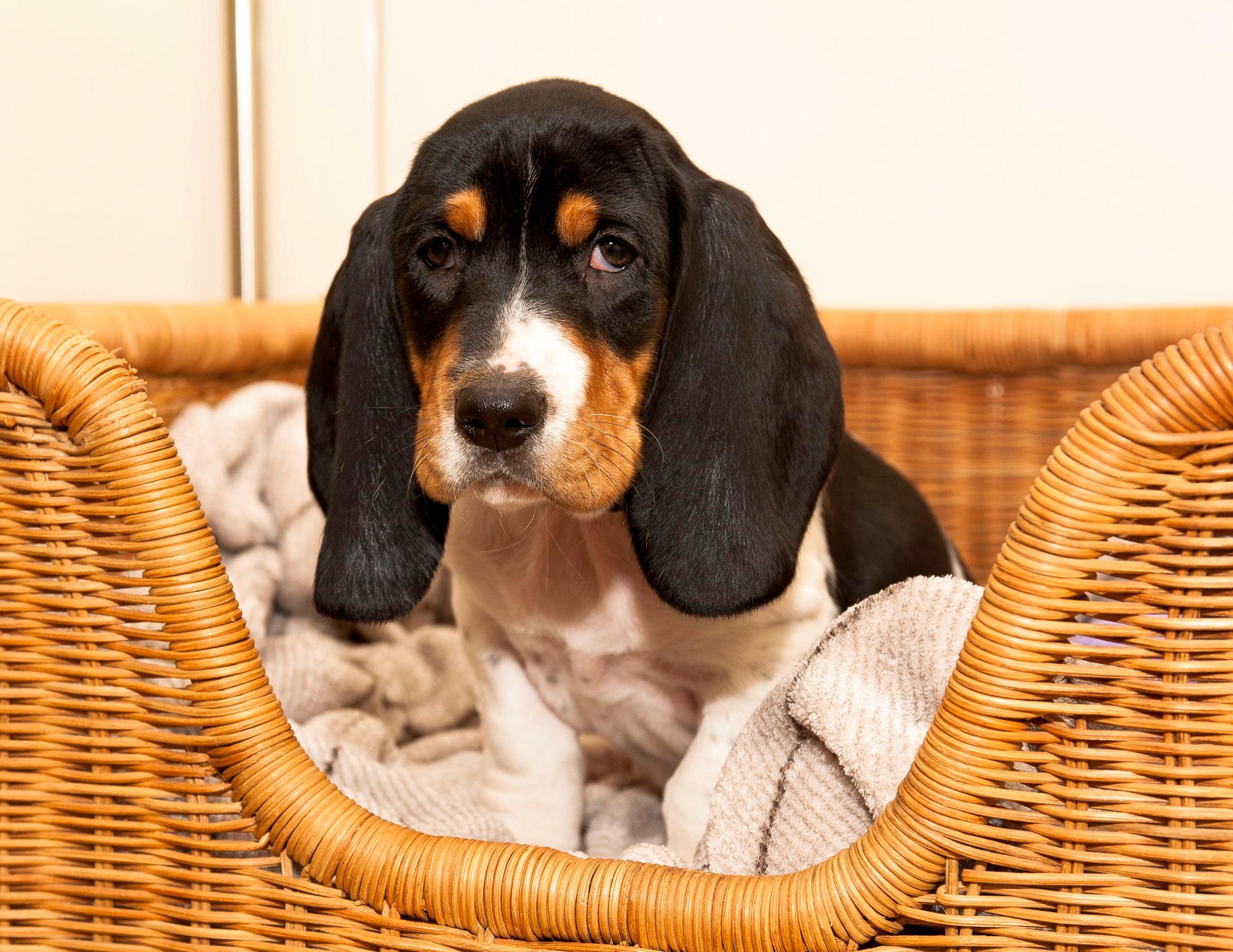 The puppy is sitting on a barrel and sniffing flowersThe puppy is sitting on a barrel and sniffing flowers