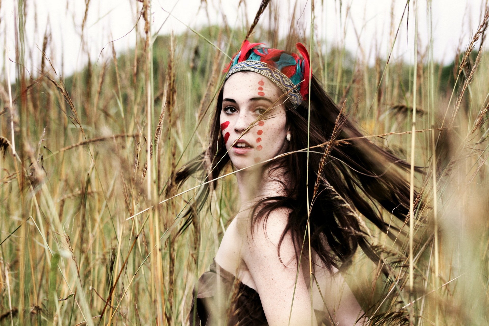 A girl in a field among grass and spikelets in the style of an indianA girl in a field among grass and spikelets in the style of an Indian