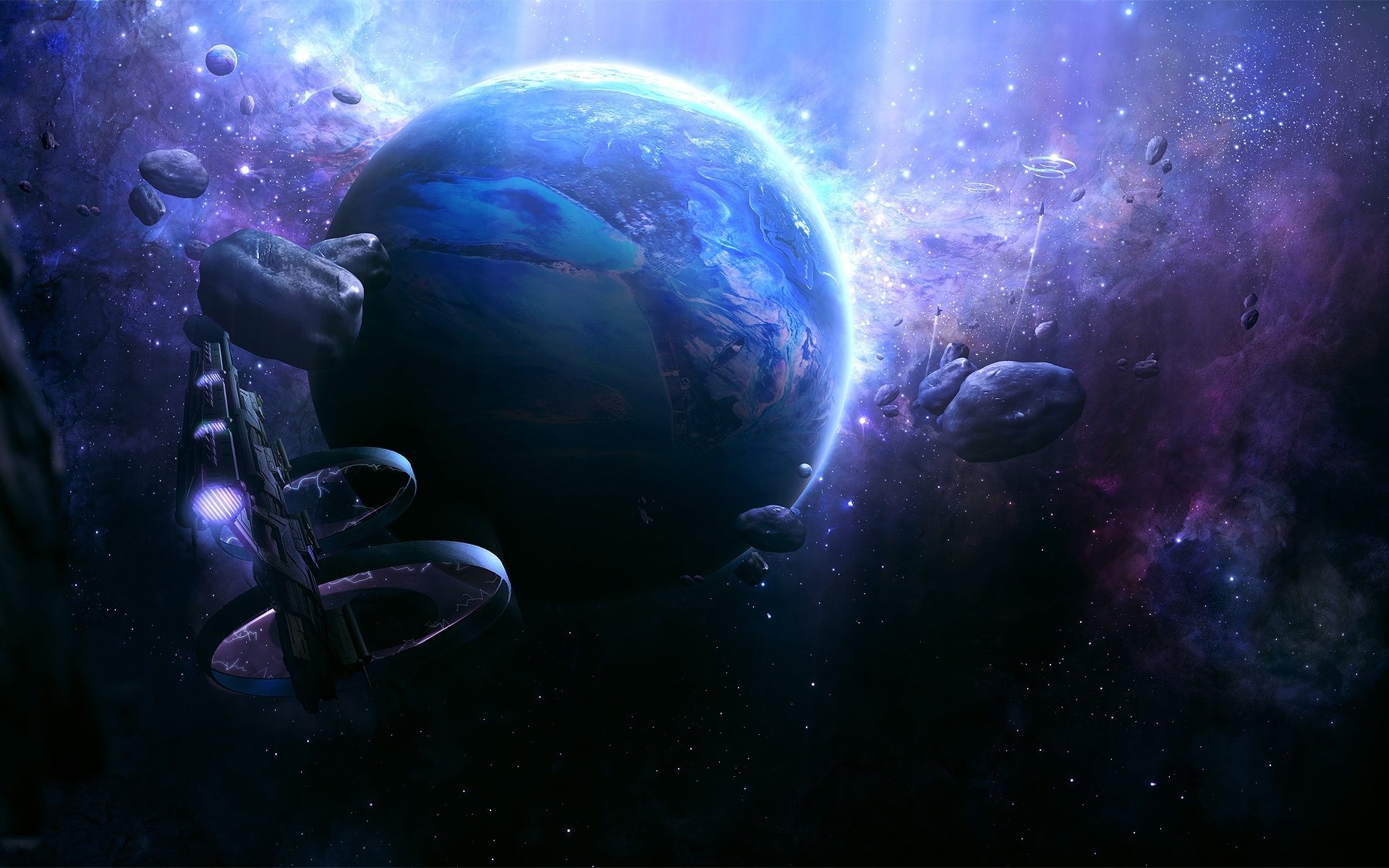 The glow of blue and scarlet in the boundless space among the planets and stars