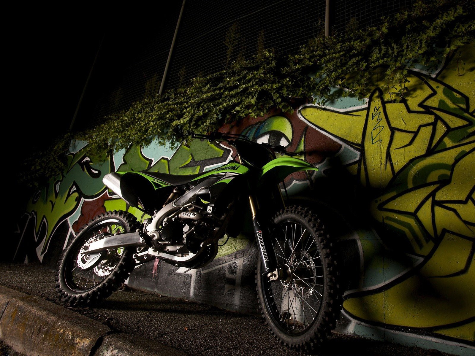 Yamaha and kawasaki stand in the city against the background of palm trees