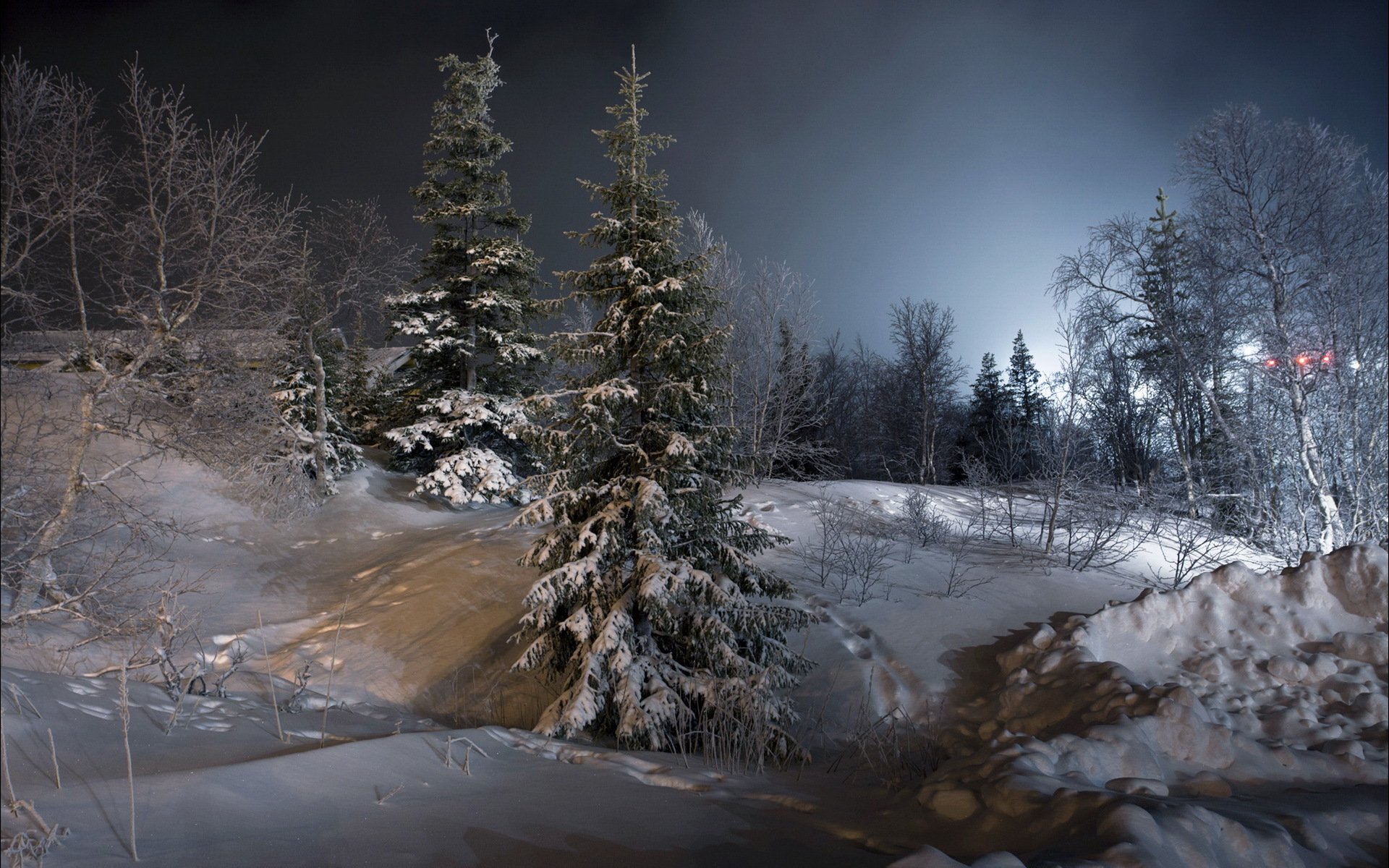 Winter forest landscape at night