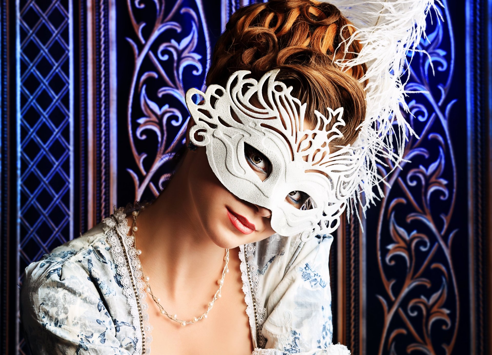 Blue eyes in a feather mask