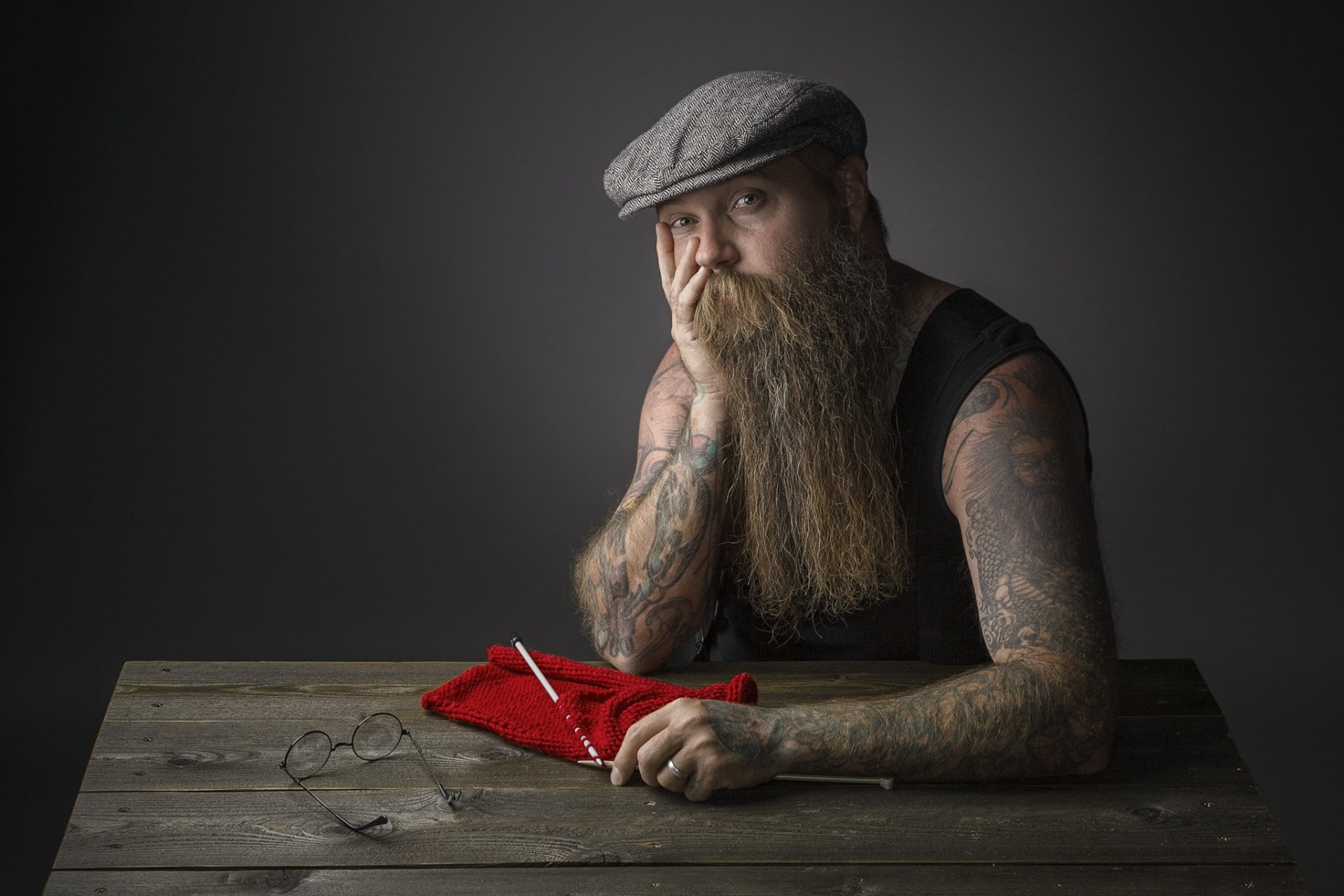 A man in a cap and with tattoos is sitting knittingA man in a cap and with tattoos is sitting knitting