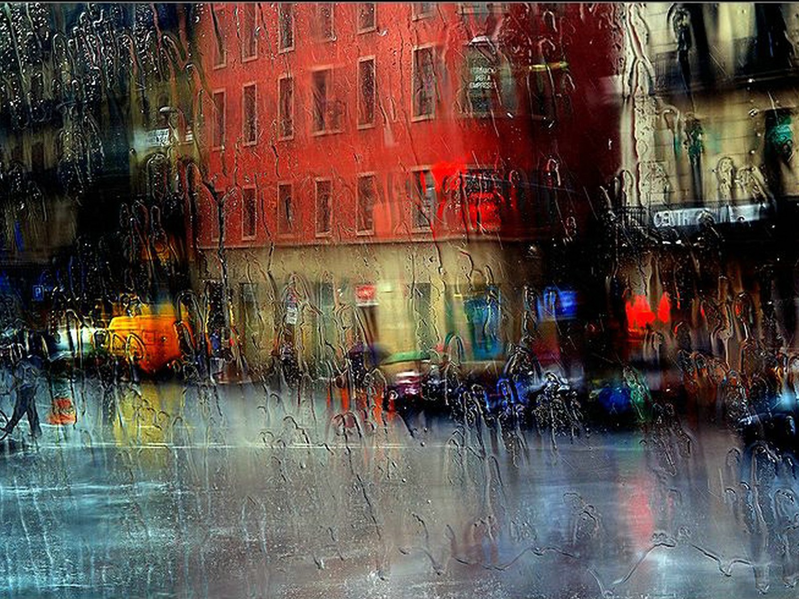 Glass in raindrops on the background of a city streetGlass in raindrops on the background of a city street