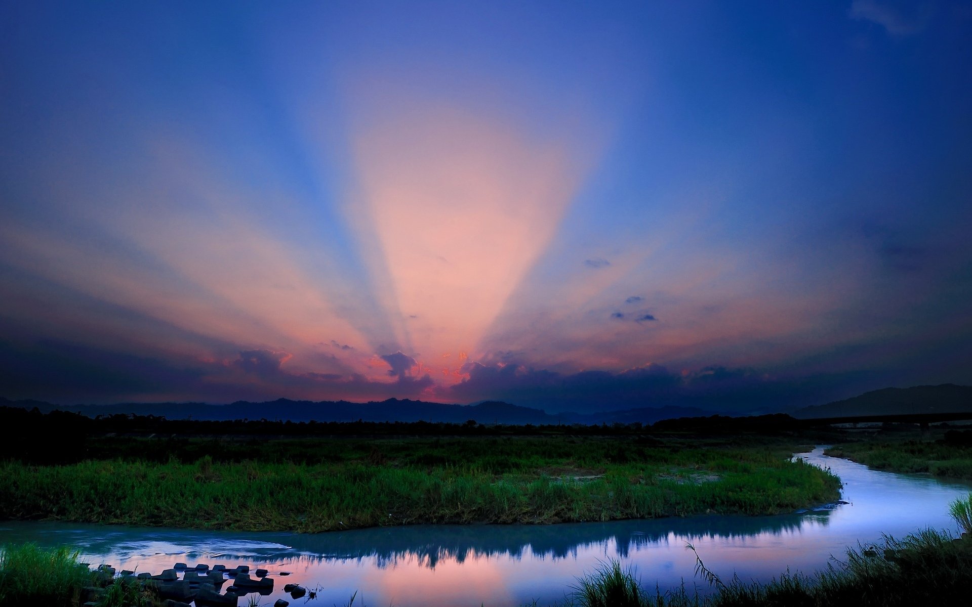 Pink clouds on the background of the blue surface of the riverbedPink clouds on the background of the blue surface of the riverbed