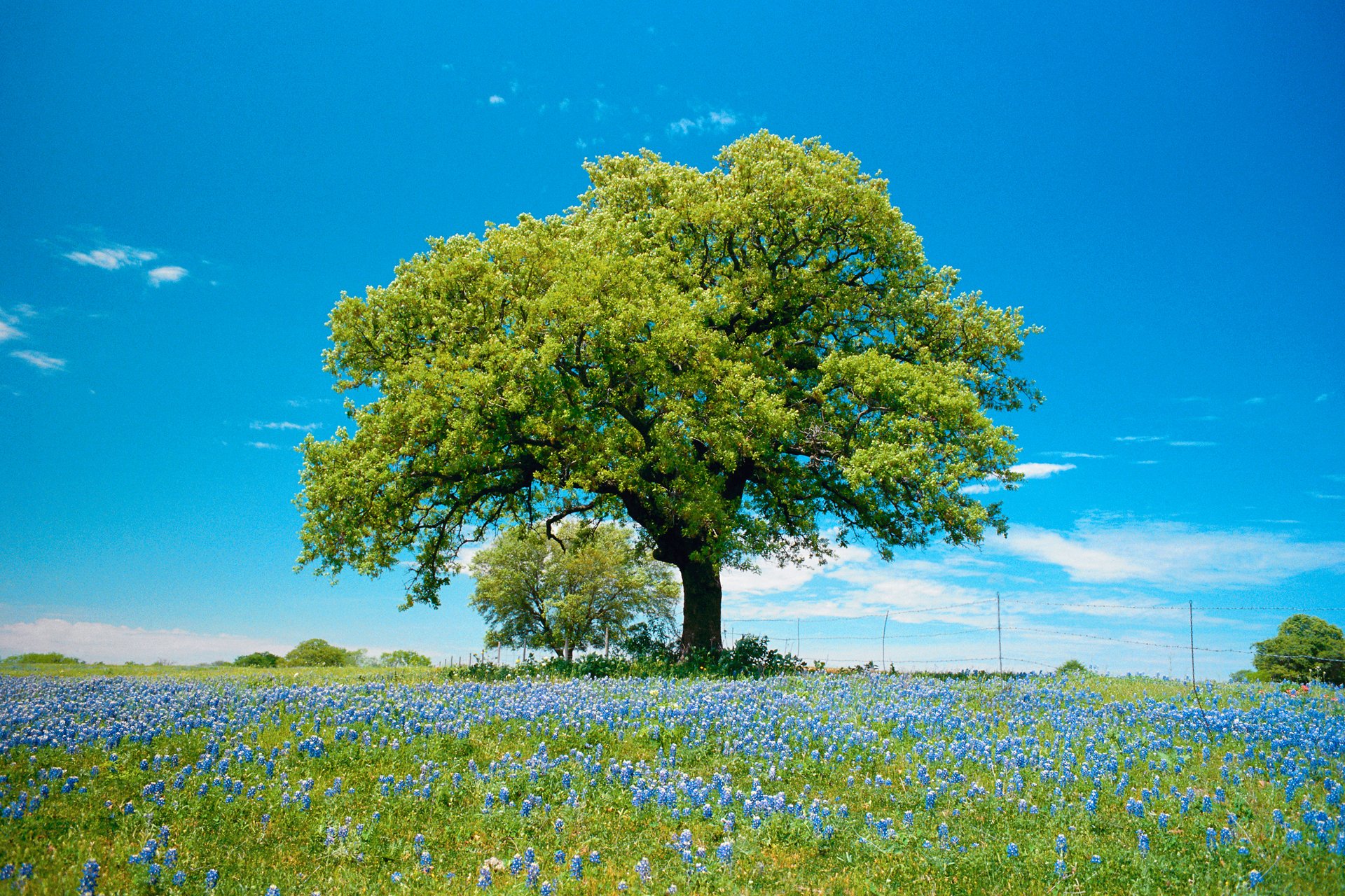 A tree on a field with blue flowers