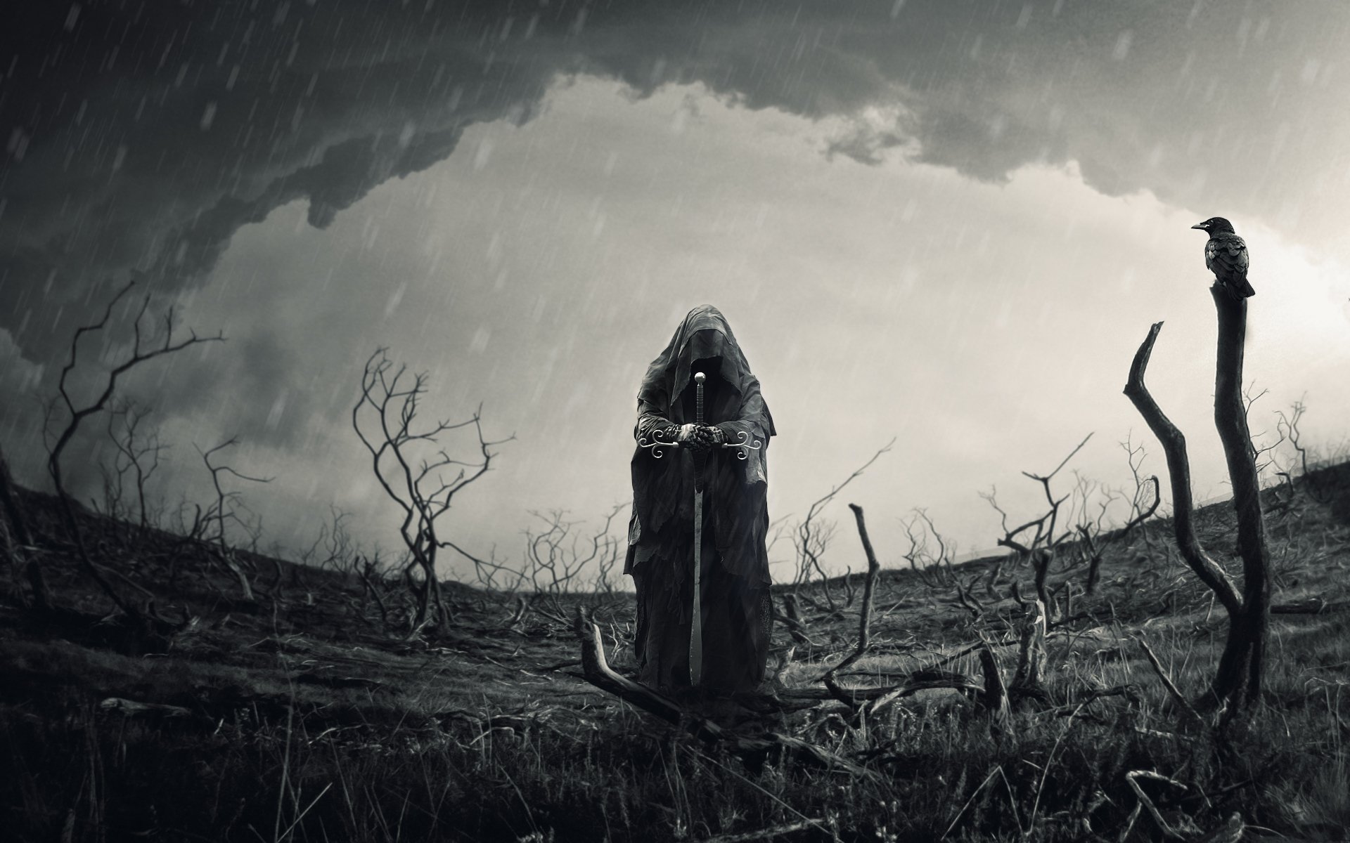 A gloomy character of the game dark souls with a sword in his hands against the background of black hazeA gloomy character of the game Dark Souls with a sword in his hands against the background of black haze