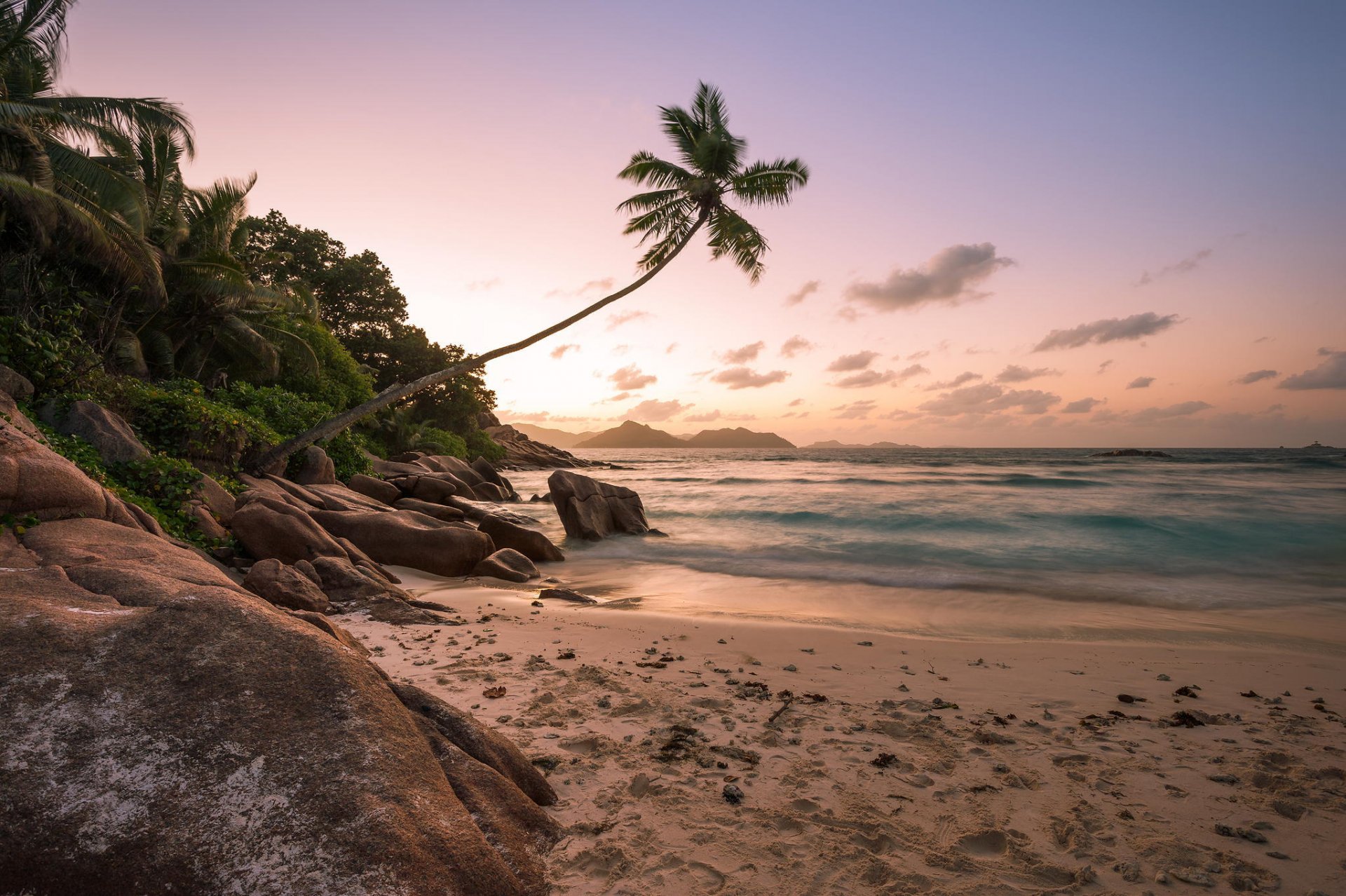 A tropical island in the ocean with palm trees above the water, clear sky and sun rays
